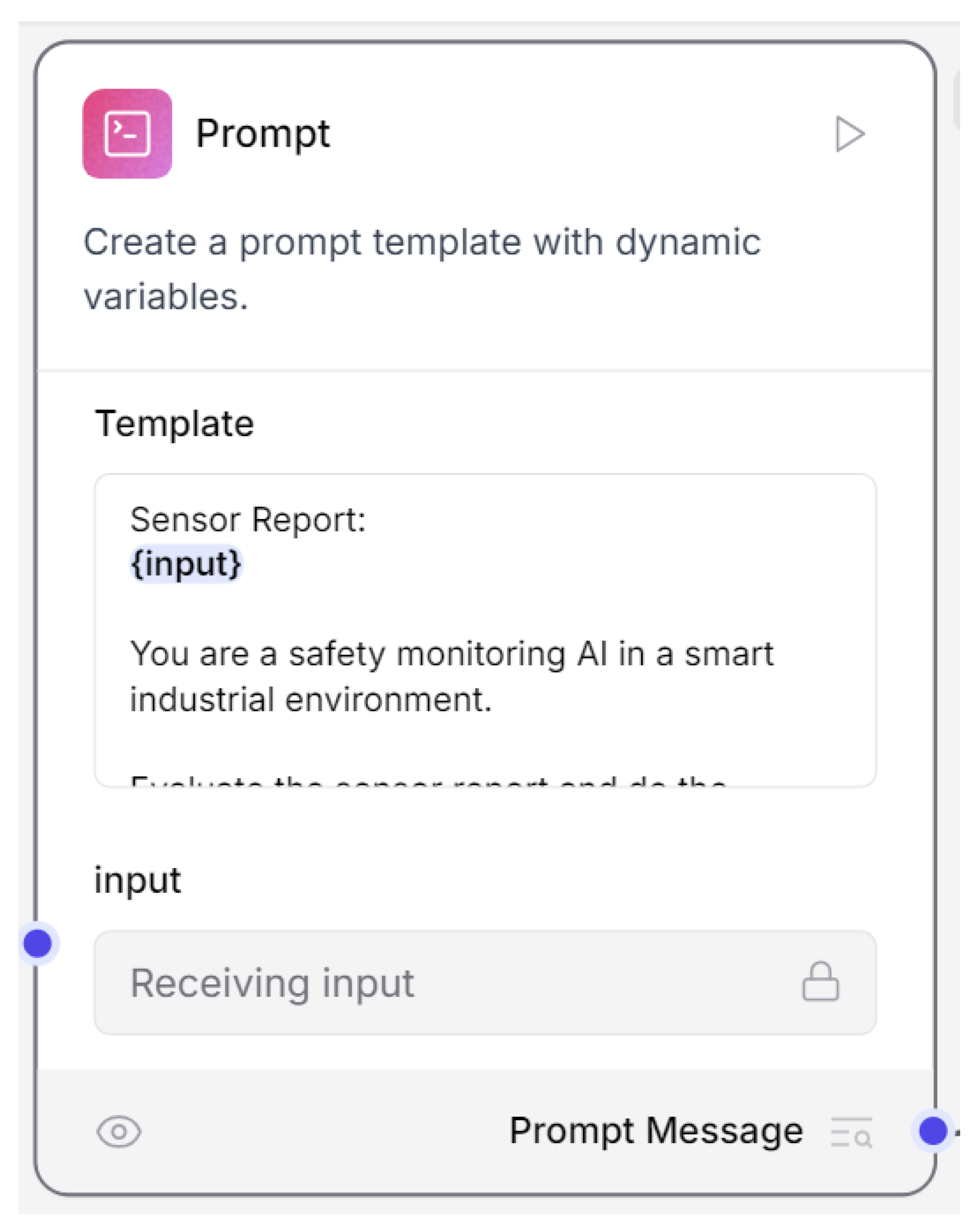 - Prompt node. This was responsible for taking this received data and sending it to the Large Language Model for interpretation and action. Figure 14 shows prompt node.