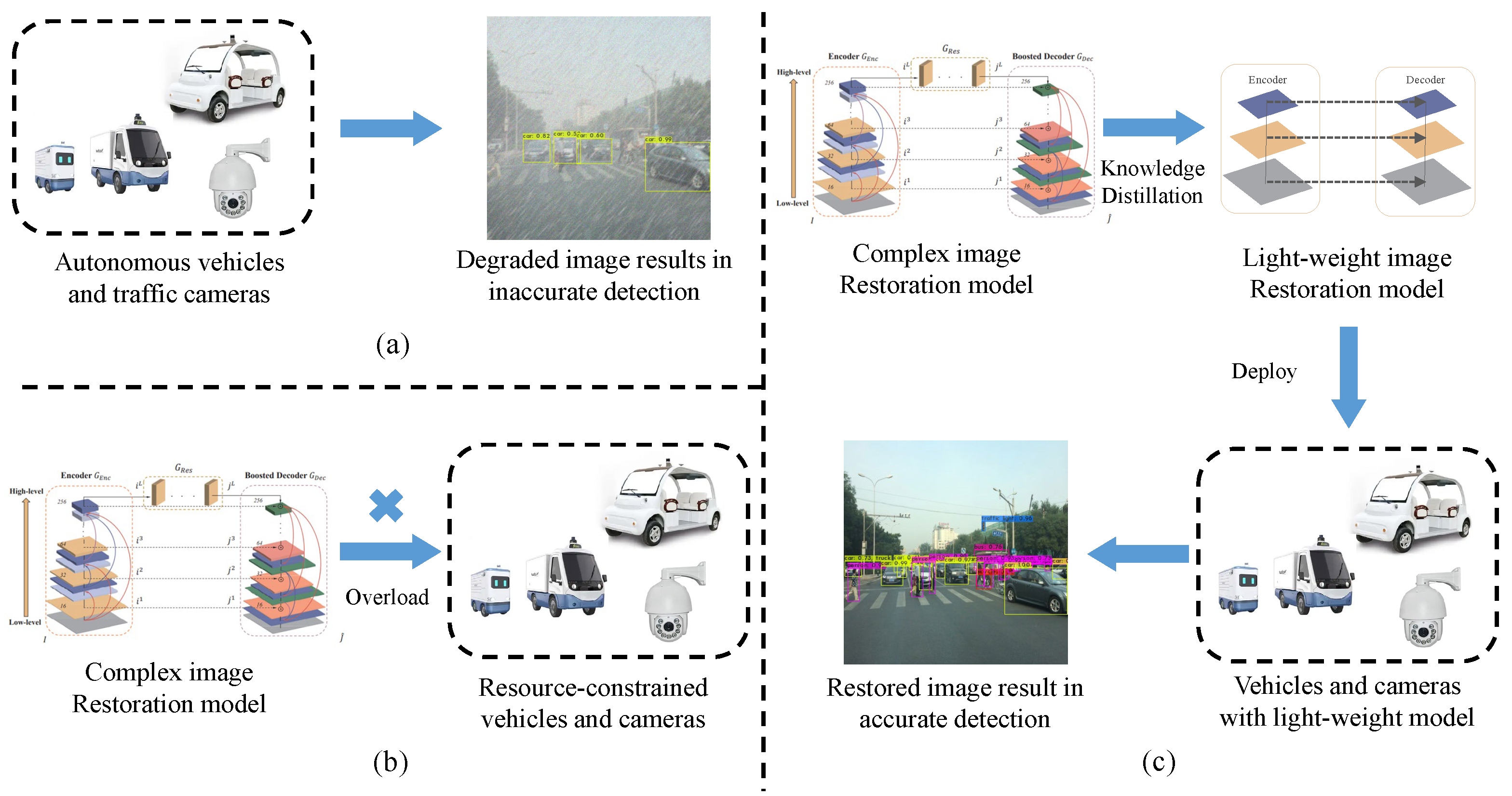 34], in terms of both computational efficiency and restoration quality. This confirms the efficacy of our SKD strategy in achieving high-performance image restoration with significantly reduced complexity, making it suitable for deployment on resource-constrained platforms such as autonomous vehicles.