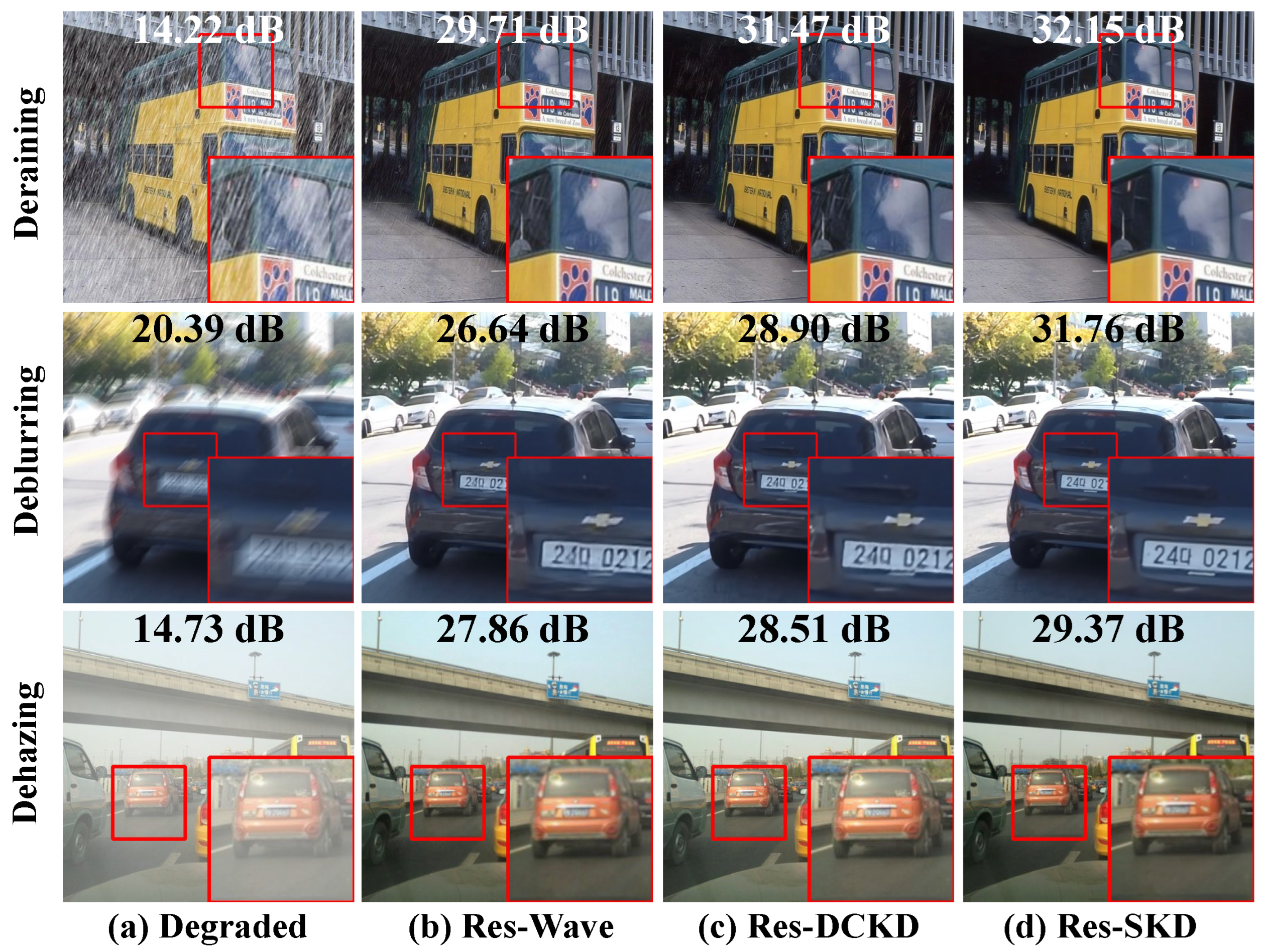 Our findings highlight the versatility and robustness of the proposed SKD strategy, which excels not only on synthetic data but also when applied to real-world challenges. This is a key strength for the deployment of image restoration models in real-time autonomous vehicle applications and other resource-limited environments.