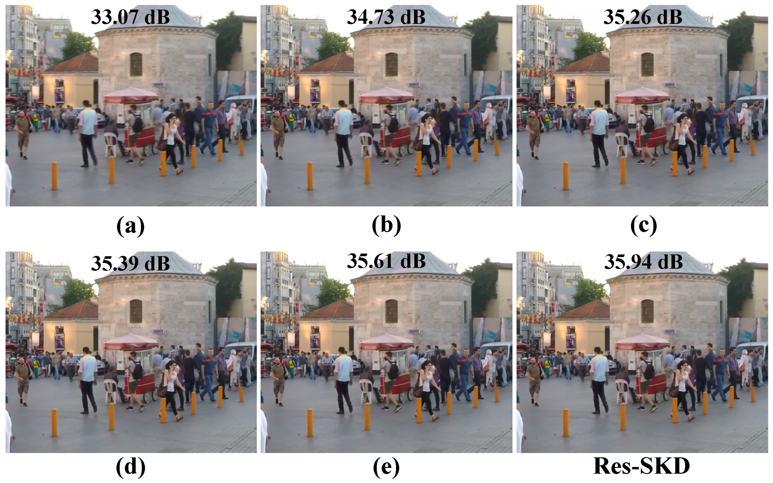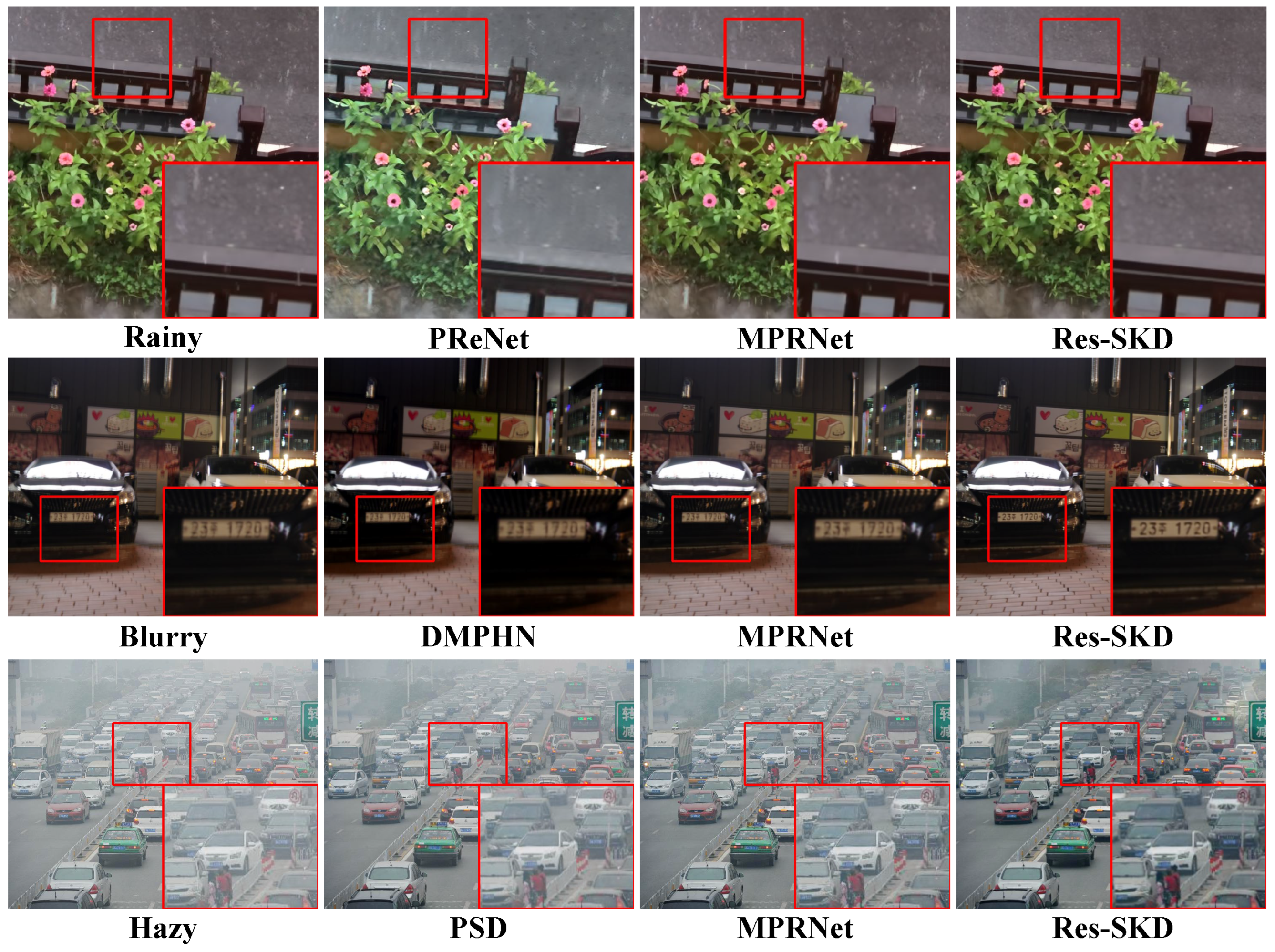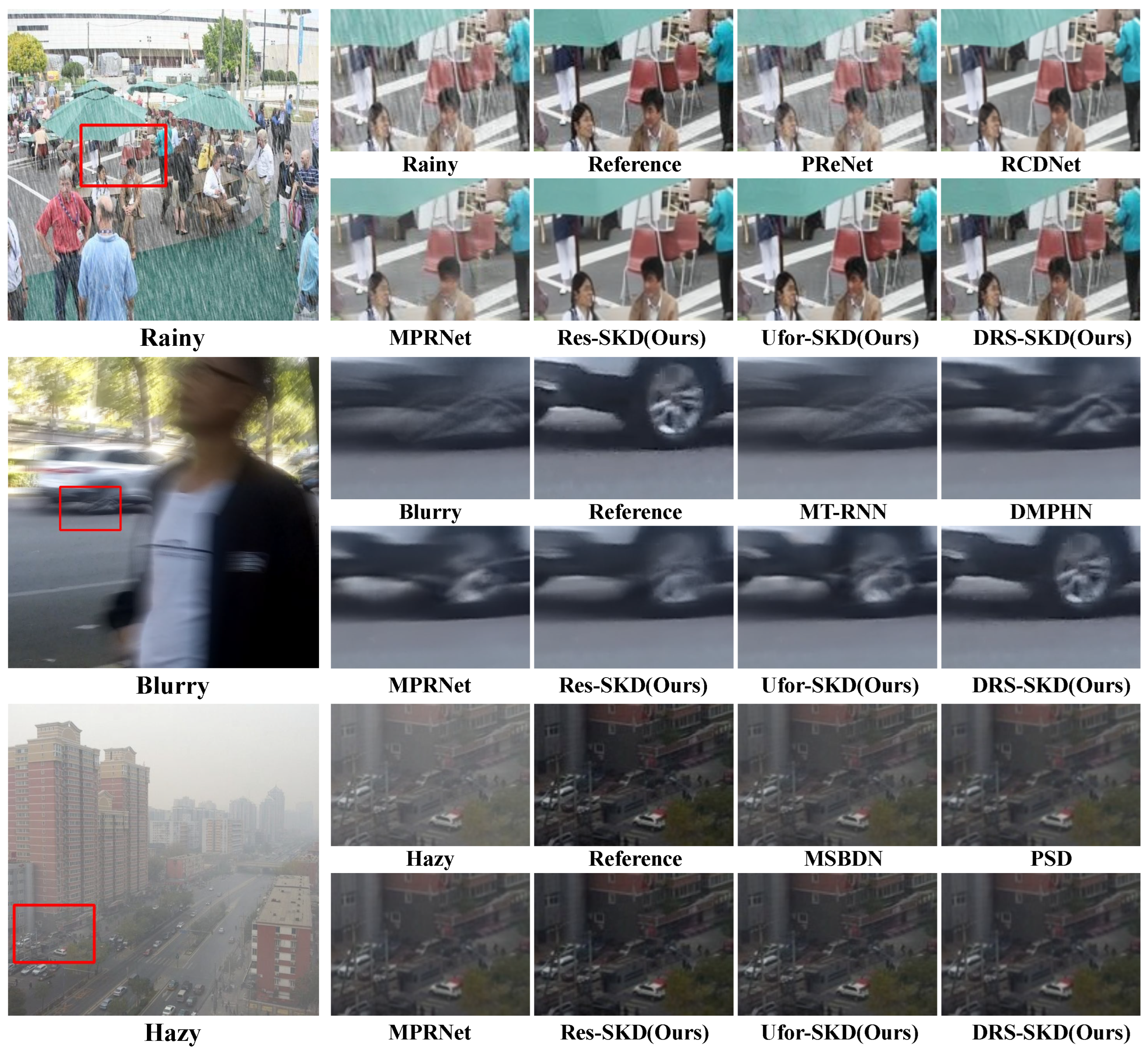 Figure 8 clearly demonstrate that Res-SKD can effectively mitigate rain, blur, and haze artifacts, yielding visually appealing and restored images that retain important fine-grained details. Furthermore, the no-reference evaluation metrics presented in
