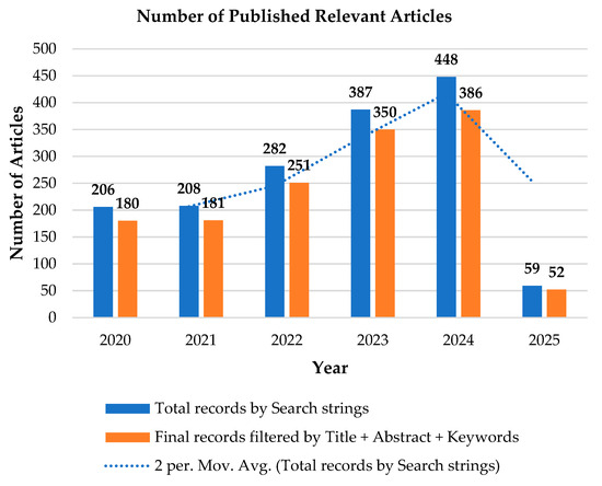 Annual Distribution of Total vs. Relevant Articles on BIM and Sustainable Design in Education (2020–early 2025).
