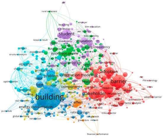 To further illustrate the evolving academic interest in BIM within sustainability-focused education, Figure 2 presents a keyword co-occurrence network generated using VOSviewer. The dataset was developed by analyzing titles, abstracts, and author keywords from 1589 documents retrieved from the Web of Science, OpenAlex, and Scopus databases (2020–2025). Co-occurrence analysis identifies frequently associated terms that appear together across these publications. The resulting visualization reveals clusters where “Building” most frequently appears as a central node, reflecting BIM’s association with building-centric research terms. It is closely linked to “sustainable design,” “education,” “energy modeling,” and “curriculum.” This indicates that the literature increasingly connects BIM with sustainability pedagogy and performance-based design. The inclusion of related terms, such as “LEED,” “simulation tools,” and “project-based learning,” further demonstrates how the discourse has shifted toward experiential and data-driven educational strategies. The color gradient reflects temporal evolution, with lighter tones representing newer research trends such as “digital literacy” and “parametric modeling.”