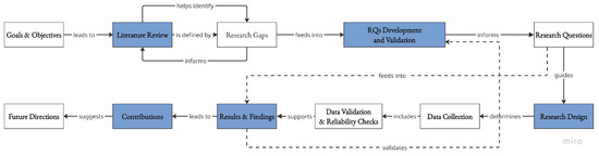 Figure 4 illustrates the research methodology flowchart, presenting a logical and iterative progression of the study from defining goals to identifying future directions. The process begins with the formulation of research goals and objectives, which guide the literature review. This review identifies existing knowledge and highlights research gaps, which in turn inform the development of research questions and validation. These questions shape the research design, which outlines the data collection strategy, comprising surveys, simulations, and case studies. Collected data undergo validation and reliability checks to ensure accuracy, supporting the derivation of meaningful results and findings. These findings yield both scholarly and practical contributions, ultimately suggesting future research directions. The flowchart emphasizes interdependence between components, reflecting a quantitative survey-based approach supported by descriptive and thematic analyses to ensure both theoretical rigor and empirical validation. Each stage of data collection and analysis was designed to correspond directly with one of the four research questions, as summarized in Table 1.
