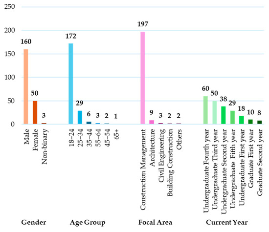 A total of 213 valid responses were analyzed, representing students from two accredited universities in the Southeastern United States. The sample was predominantly undergraduates (approximately 96% were pursuing a bachelor’s degree) with a small number of graduate students (4%). In terms of discipline, the majority (about 93%) were Construction Management majors, reflecting the large enrollment of that program in the sample. Roughly 6% were Architecture students, and the remaining responses came from other disciplines such as Civil Engineering (1%). The sample’s demographic composition was 87% male and 13% female. It included a diverse range of backgrounds, with approximately 65% of respondents identifying as Caucasian, 10% as African American, 13% as Hispanic, and the remainder reporting as multi-racial or in other categories. A significant portion of participants (approximately 75%) had some prior work experience in the construction industry, although it was typically limited, with most having 1–4 years of experience (approximately 13% having 5–10 years). For most respondents, this “experience” refers primarily to internships, cooperative education placements, and academic capstone projects rather than full-time professional employment. These opportunities allowed students to gain exposure to real construction workflows, project documentation, and limited BIM applications under supervision. This early experiential learning helps contextualize their classroom knowledge but does not yet equate to industry-level proficiency. Figure 5 illustrates the proportion of students across degree levels, disciplines, and prior experience categories.