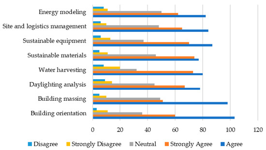 The relevant survey responses assess students’ agreement on whether BIM can aid various aspects of sustainable design. The aspects include building orientation, massing, daylighting analysis, water harvesting, sustainable materials, sustainable equipment, and site and logistics management.