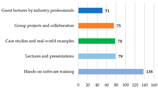 Integrating BIM with sustainable design education presents both opportunities and challenges for educators. Several studies have explored pedagogical approaches, particularly Project-Based Learning (PBL) and case studies, when teaching BIM in sustainable design contexts [33,34]. For example, Atabay et al. (2020) assessed the outcomes of embedding both BIM and green building concepts within engineering programs, finding notable gains in students’ analytical and collaborative skills [33]. According to Shen et al. (2012), PBL encourages students to engage in real-world problem-solving, where they can apply BIM to develop sustainable building solutions, such as conducting energy modeling and selecting sustainable materials [23]. Recent research by Lee et al. (2023) and Tijo-Lopez et al. (2024) found that incorporating BIM-enabled sustainability capstone projects significantly improves graduate employability and workplace readiness [22,35]. These methods provide students with the hands-on experience necessary to understand both the technical aspects of BIM and the conceptual elements of sustainable design [1,8].