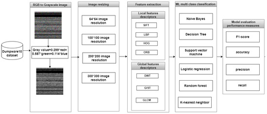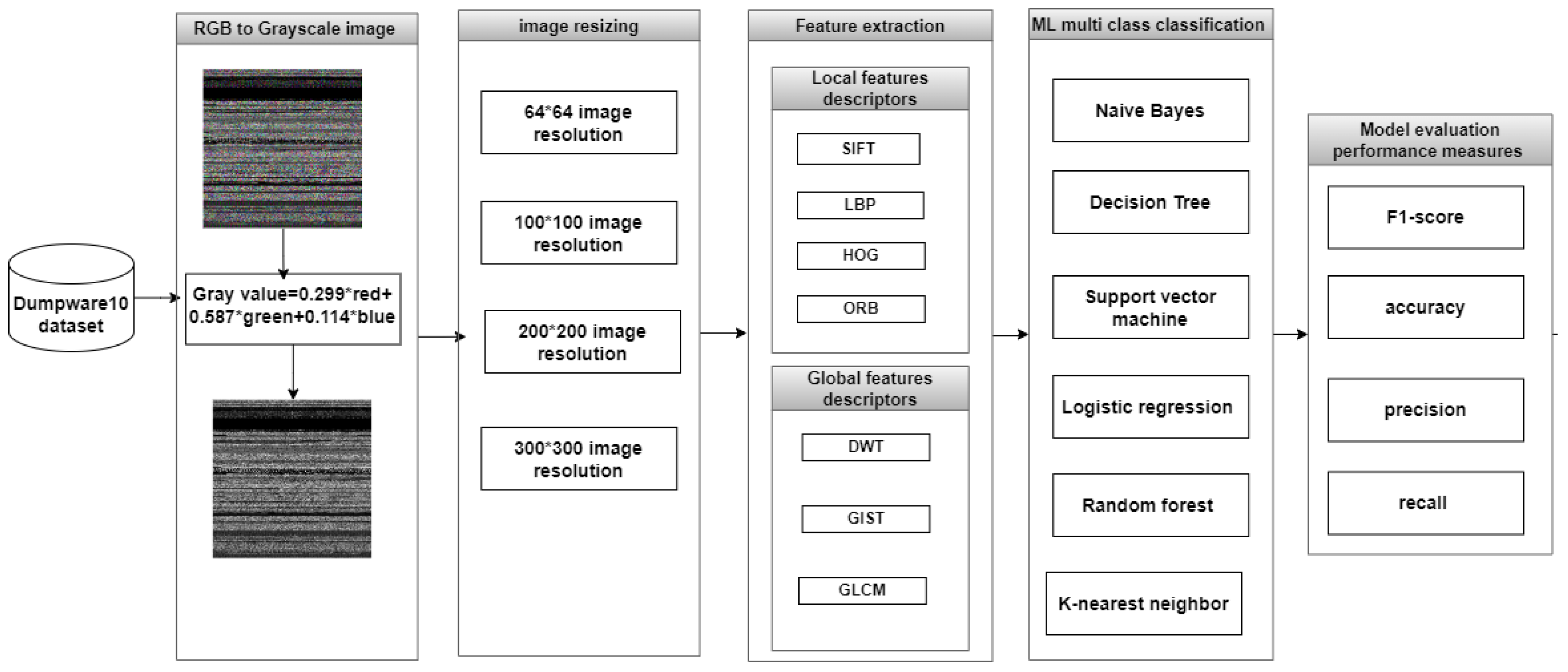 The proposed approach follows a memory forensics and pattern detection approach, which includes four steps. First, it transforms the RGB images, which are extracted from memory dumps, into grayscale images because the applied texture descriptors in this study are designed to operate on intensity variations rather than color information, thus regularizing the data to give better pattern analysis. Second, it resizes the grayscale images into further resolutions, which are 64 × 64, 100 × 100, and 200 × 200, along with the original resolution, which is 300 × 300 pixels. It further resizes the images into those resolutions while seeking to optimize computational efficiency and carry out performance comparisons at different image scales. The resolutions 64 × 64, 100 × 100, 200 × 200, and 300 × 300 were selected to examine the impact of image size on performance and computational cost. The 100 × 100 resolution corresponds to the LIME-cropped output size, while 200 × 200 serves as an intermediate level between compact and full-resolution images. Third, it extracts the local and global texture features from the resized grayscale images using the different descriptors: Local Binary Patterns LBP, Histogram of Oriented Gradients HOG, Scale-Invariant Feature Transform SIFT, Oriented FAST and Rotated BRIEF ORB, Discrete Wavelet Transform DWT, and Grey Level Co-occurrence Matrix GLCM. This is further analyzed individually and in various combinations of each feature combination with several machine-learning models to determine the best classifier for malware family detection and classification. Next, the proposed approach evaluates the classifiers: Decision Trees, Support Vector Machine (SVM), Naïve Bayes, Random Forest, K-Nearest Neighbor (KNN), and Logistic Regression.