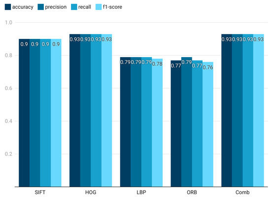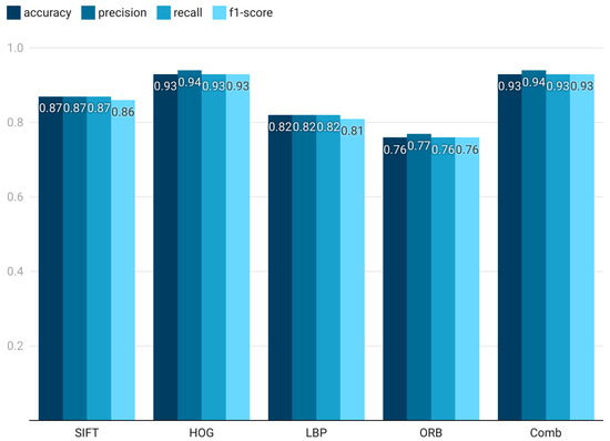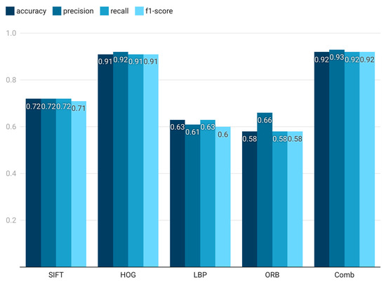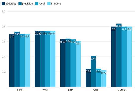 Local texture descriptors provide detailed information on the local structure by extracting spatial patterns and textural characteristics within specific regions of the image. They provide a deeper understanding of the image content compared to global descriptors. Some descriptors, like SIFT and SURF, are robust to lighting, scale, and rotation variations. Although some descriptors are computationally expensive, others, like LBP, are very efficient. However, they provide a limited scope by focusing on specific regions and may miss the information about the broader context of the image. In addition, some of the descriptors are sensitive to noise. The following local texture descriptors were used in this work.