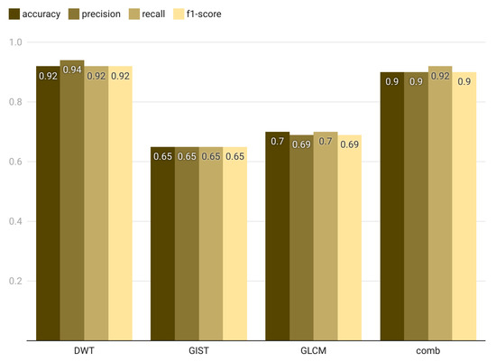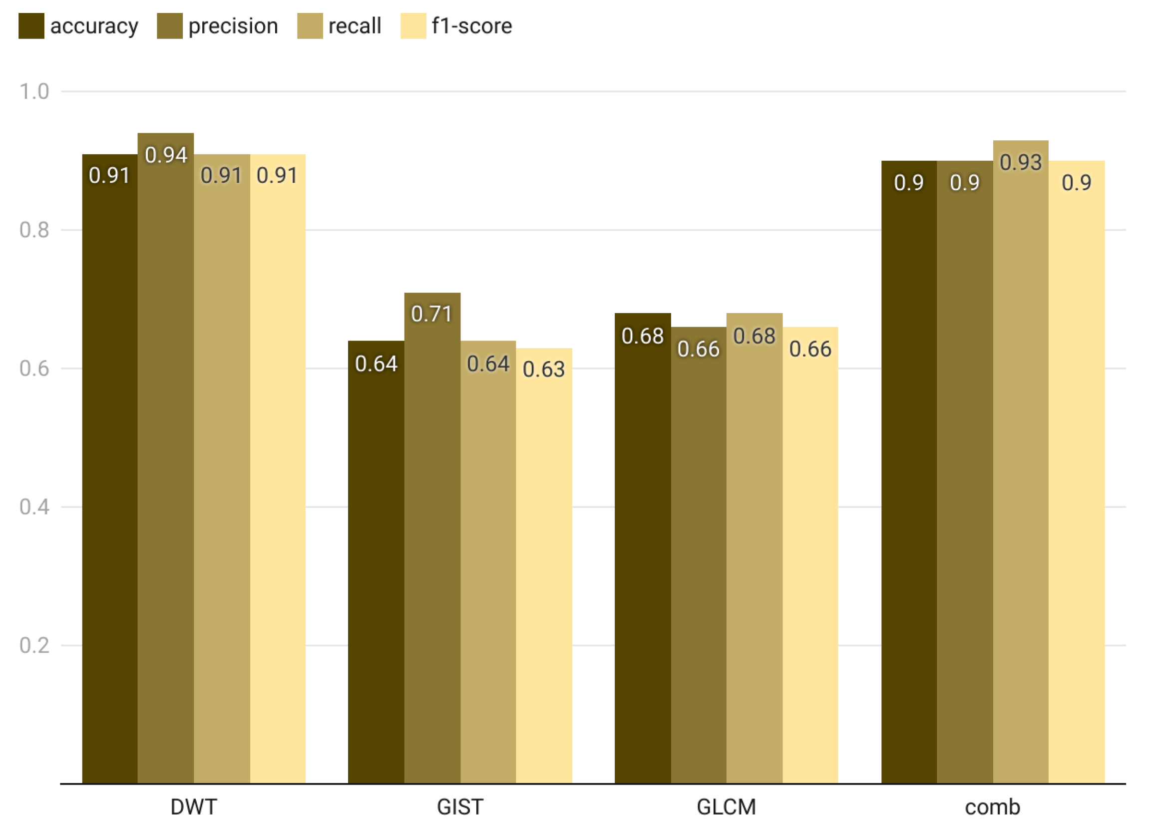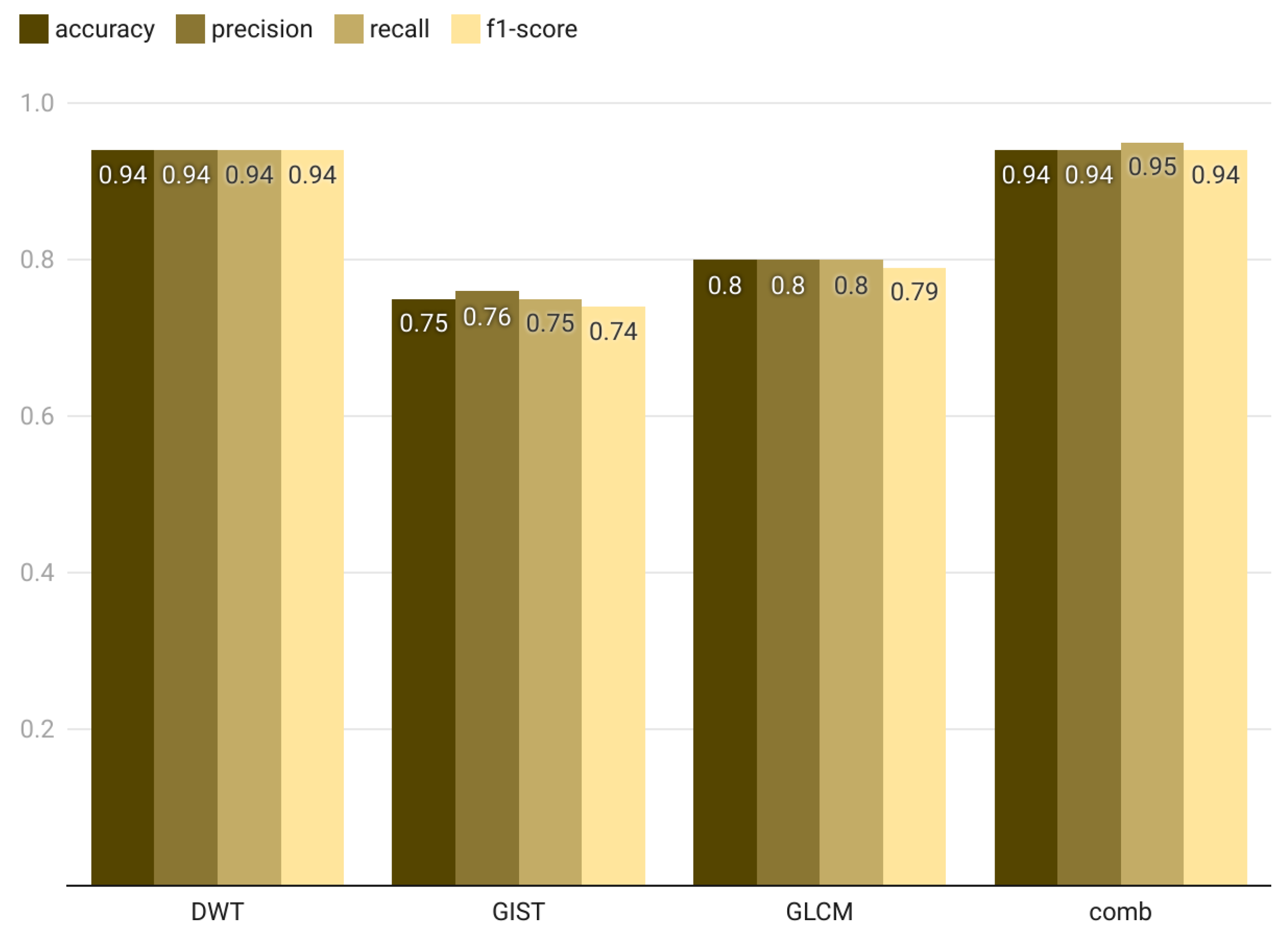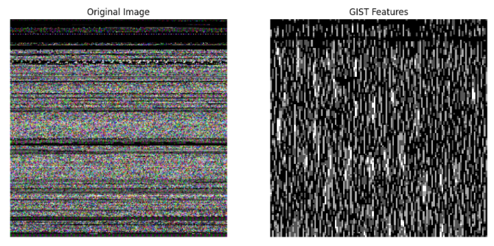 Discrete Wavelet Transform (DWT): It provides information at different scales and orientations by breaking the image into distinct frequency subbands. The decomposition offers a multi-scale analysis for feature extraction. However, the DWT is not a global descriptor in the same sense as GLCM or GIST. Still, it can offer a basis for extracting other features that can be useful for image analysis, such as malware identification in memory dump visualizations.