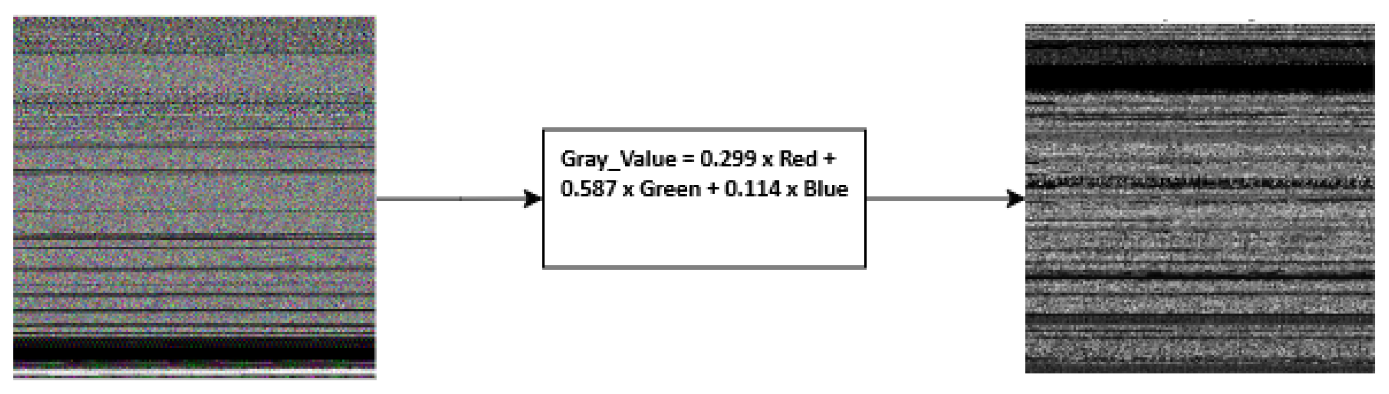 35], a widely used open-source computer vision library, provides the cv2.cvtColor function to convert RGB images to grayscale. This process removes the color components and focuses solely on the intensity information of each pixel, which represents its brightness level. In other words, the conversion discards hue and saturation, retaining only the luminance values that define the grayscale image. The formula used for this conversion is shown in