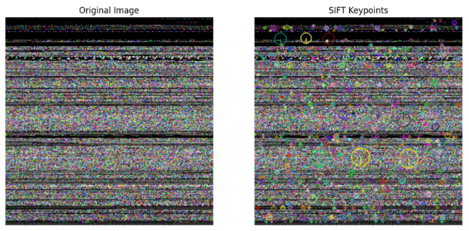 Figure 5 shows an example of SIFT key points visualization extracted from a malware image belonging to the Adposhel malware family. To deal with the variable-length set of SIFT descriptors and convert them to a fixed length, we used the Bag-of-Visual-Words (BoVW) approach. The SIFT descriptors, which are extracted from training images, are clustered using the K-Means algorithm to visualize the vocabulary, where each cluster center represents a visual word. Furthermore, each image is encoded as a histogram that counts the occurrences of these visual words to capture the distribution of the local patterns of the image effectively.