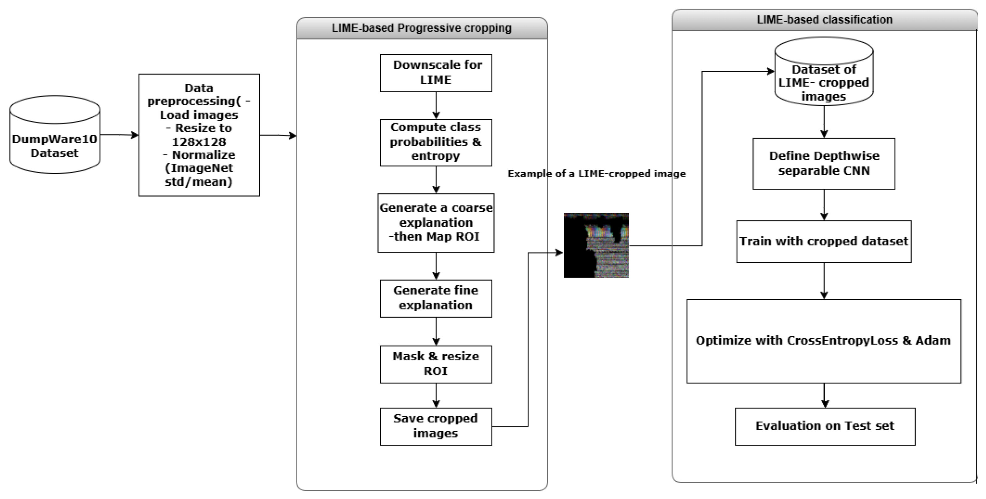 Application of LIME for feature region identification: The key contribution in this study is the application of LIME on the memory forensics images to dynamically identify, focus, and crop important regions of images.
