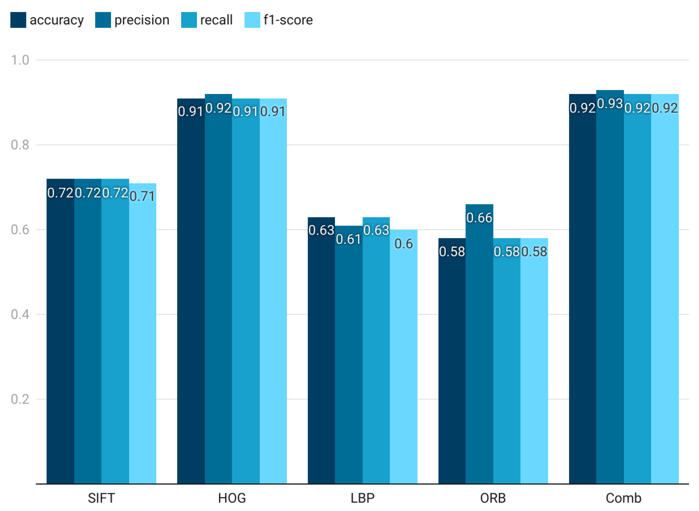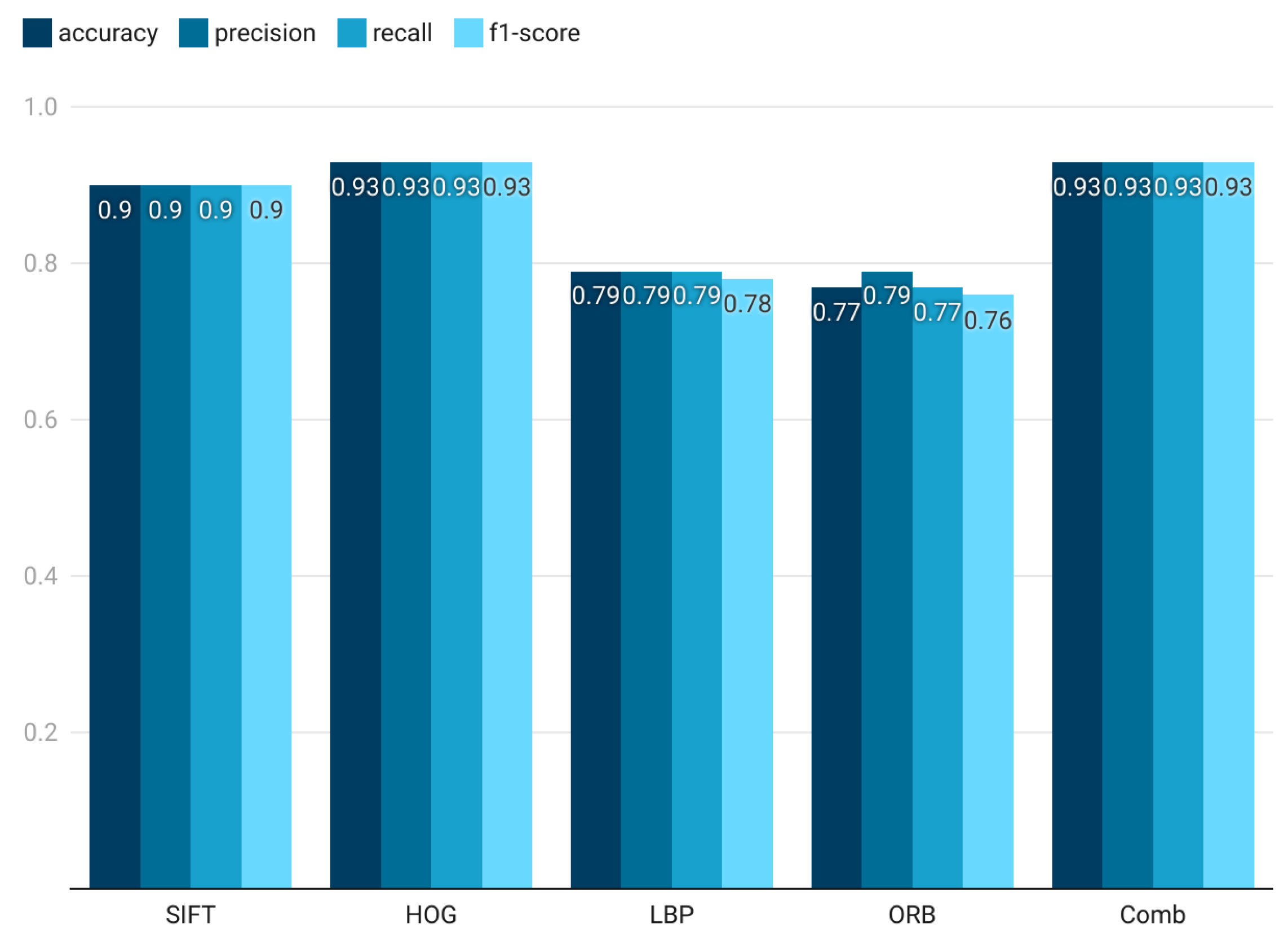 | Our work (Texture-based) | Grayscale images | Local + Global Texture Descriptors (e.g., HOG, SIFT, DWT) | ML Classifiers (SVM, RF, LR) | 64 × 64 to 300 × 300 px | F1-score of 95% at 200 × 200 with combined descriptors |