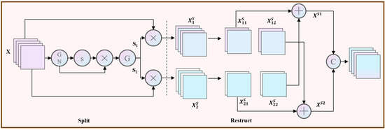 Subsequently, the input tensor X is element-wise-multiplied with S1 and S2 to yield two distinct feature sets: possesses rich spatial information while has little information, which is considered redundant. Based on this, we propose a reconstruction operation to combine these two features to generate a feature with more information and reduce spatial redundancy. The process is as follows: