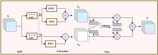 where and represent the weight matrices generated in the two convolution operations, respectively. In this way, relying on the GWC and PWC of X1, rich information Y1 is extracted at a relatively low cost.