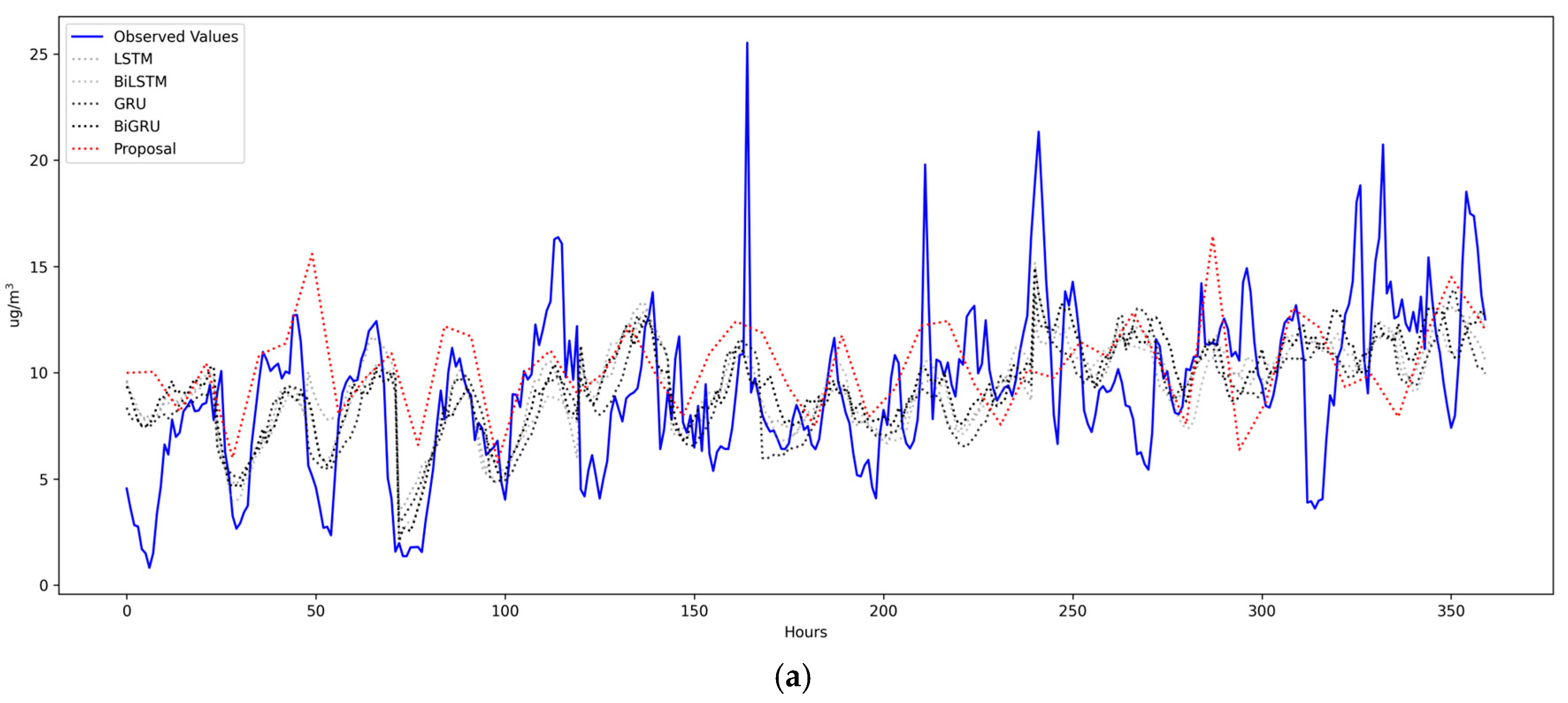 3. Finally, for the Espinar station, the proposed model is the best, achieving the lowest RMSE, equal to 11.4006 µg/m