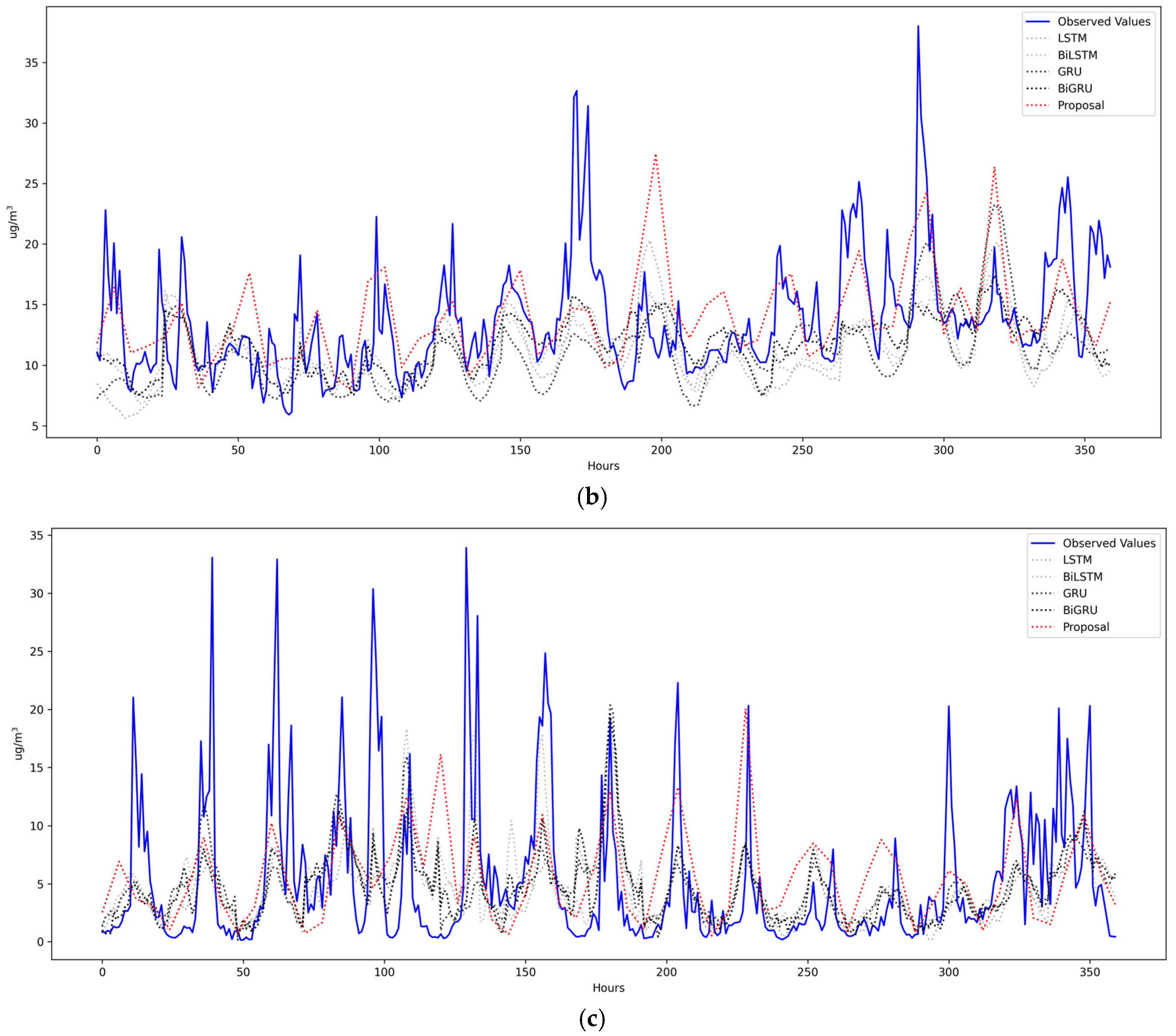 3, while the proposed model ranks last. For the Uchumayo station, BiGRU presents the lowest RMSE, equal to 4.3567 µg/m