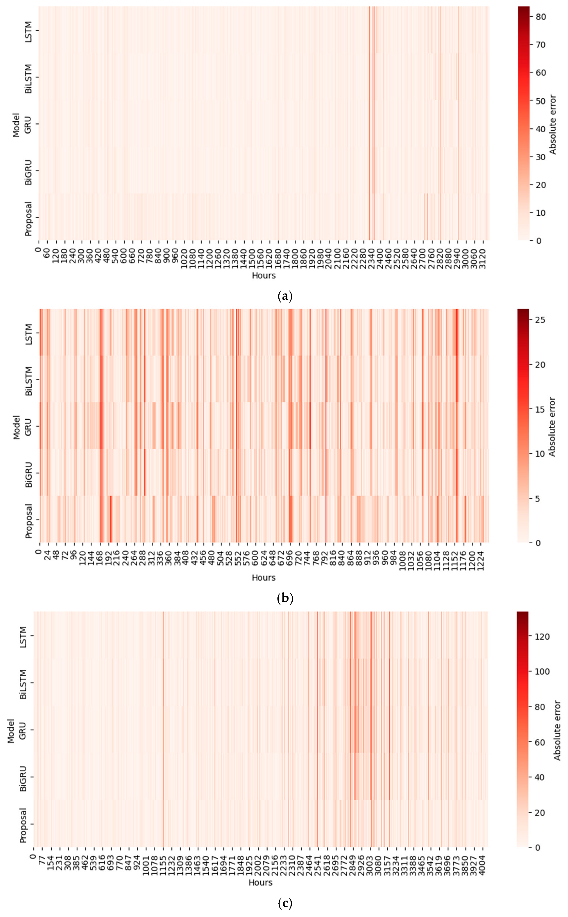 Figure 7c, the absolute errors are larger than those in the previous stations, ranging between 0 and 120. The distribution of the errors is similar for all models, with the highest concentrations between hours 2772 and 3234. However, it can be seen that the proposed model shows a lower concentration of errors compared to the benchmark models, which is reflected in the model’s performance.