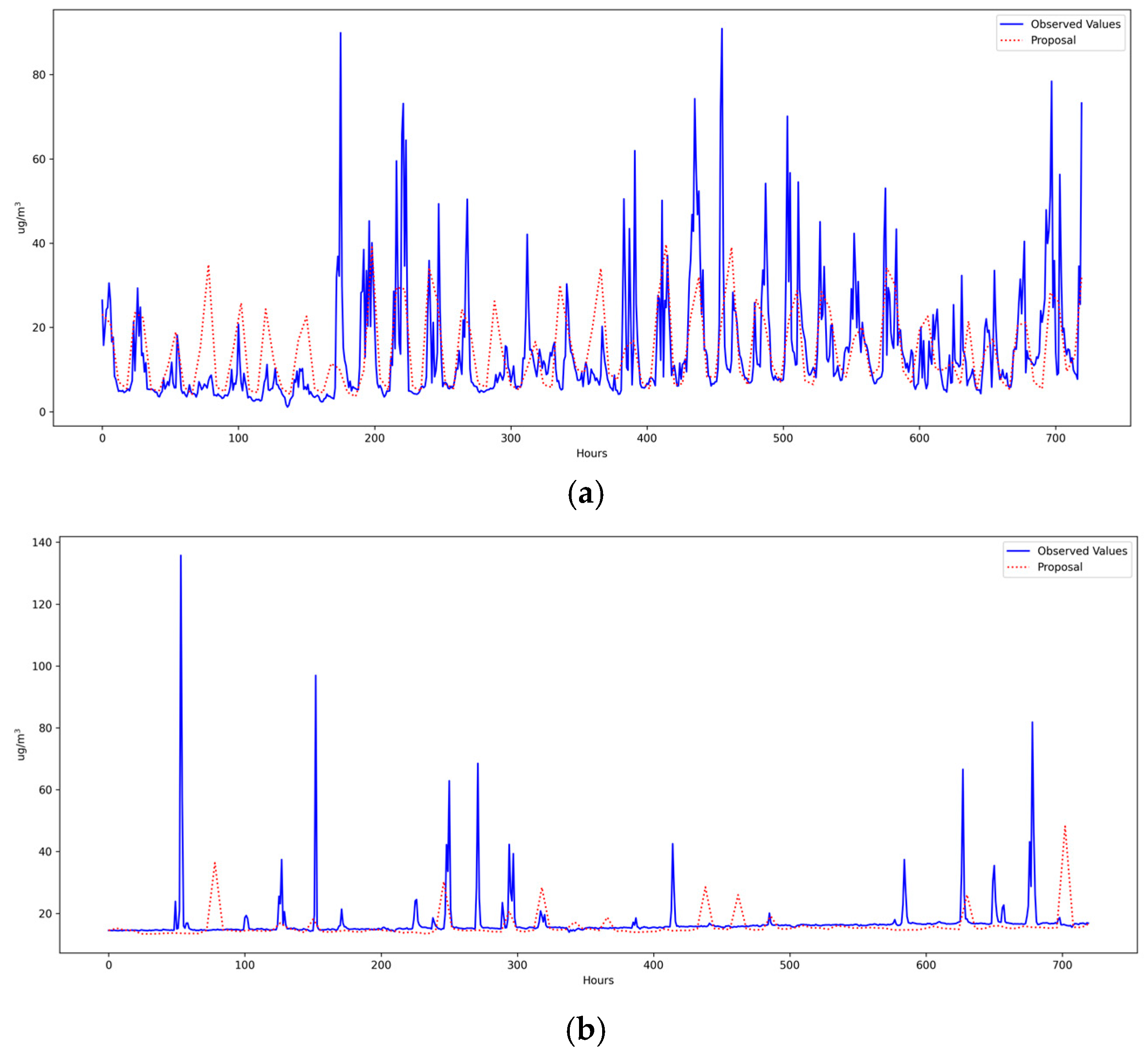 Table 14, it can be observed that the model’s performance is similar to that obtained for the three mining area datasets, with a noteworthy performance at the Pardo station, showing 10.2005 µg/m