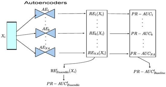 where index t runs over all possible test files (from 1 to 20) and represents the number of AEs. The ensemble reconstruction error is then used to rank the data points and compute the PR curve. The corresponding area under the curve for test partition t, , is used to assess the quality of the ensemble by averaging over the 20 datasets (Figure 1 and Algorithm A1 summarize this process):