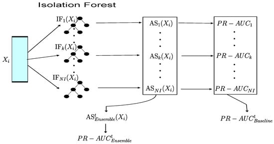 As we mentioned above, the system evaluation using an individual (IF) model might not adapt effectively to all variations in the data distribution. Furthermore, a single model could become biased toward specific patterns or fail to capture the broader complexity of the underlying problem. To address this limitation, we combine the predictions of multiple IF models into an ensemble-based voting system. Consequently, the ensemble of IFs helps to reduce the variability and improve the robustness of the detection results. In this work, we used the same 150 random IF models as in the baseline approach. Each IF model was trained on data with different variability (depending on the training set size). In the ensemble approach, we compute the AS for each IF model on the test dataset and aggregate these scores using a soft voting mechanism across the ensemble: