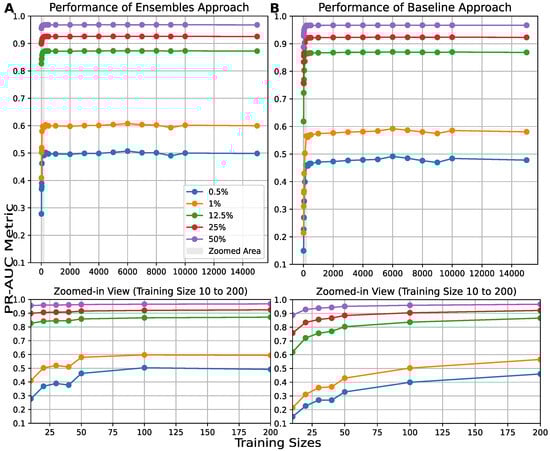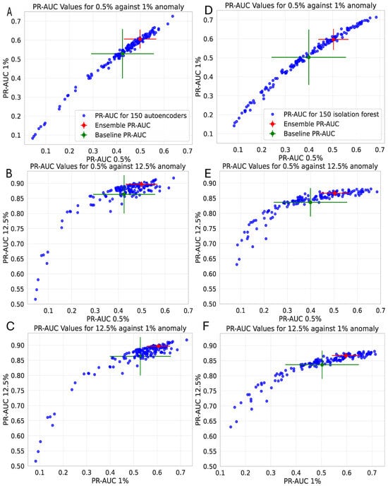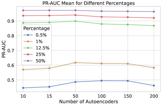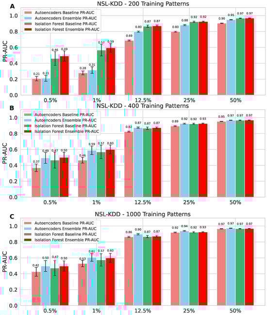 Panel A presents the best results for the IF ensemble when the training data size is very small (see Figure 5A). We can observe that the panel indicates that the IF ensemble outperformed the AE ensemble in terms of results under an unbalanced representation of attacks in network traffic. IF-based ensembles are known to achieve optimal performance with fewer training records [], as observed in our experiments. Conversely, when the attack representation was balanced at 50%, the results for both ensembles of AEs and IFs showed minimal differences. In contrast, AE-based ensembles required more training data to achieve comparable performance. Therefore, panel B presents the results based on the distribution of normal traffic records among the individual components of the ensembles, implying that each model was trained on a dataset with little overlap. At this stage, the ensembles reach a point where the stabilizes (see Figure 4A). This panel emphasizes that when each model within the AE ensembles is trained with an adequate amount of data, both ensembles achieve nearly identical results. Panel C highlights the best results achieved by the ensemble method using AEs (see Figure 4A). The ensemble model generally outperforms or matches the baseline, particularly at reasonably balanced attack ratios, where increasing the size of the training dataset leads to improved values.