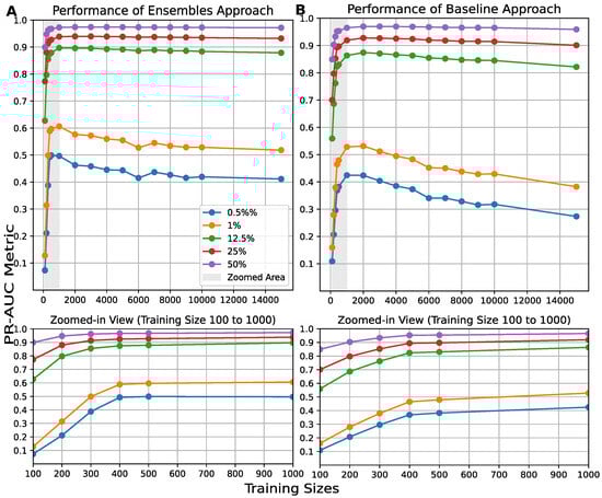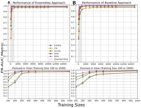 results of 150 AEs for (A) the ensemble and (B) the baseline approaches with different training sizes ranging from 100 to 15,000, and for different ratios of benign and malignant traffic for the CIC_IoT-2023 dataset.