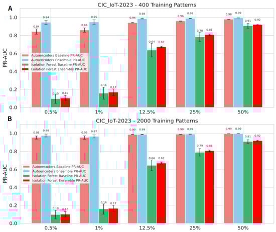 We extended the analysis of the impact of the number of training patterns on the ensemble of AEs and IFs to the CIC_IoT-2023 dataset using a similar procedure to the NSL-KDD dataset (see Section 3.1.2). As shown in Figure 8A, the ensemble of AEs achieves exceptional detection for severe anomalies, significantly earlier than the baseline, with approximately 2000 records. Moreover, it yields better results of a close to one, with a balanced ratio of attacks, employing only 300 training records. The results, included in Appendix A.2, provide similar insights; however, the differences between balanced and imbalanced datasets are less pronounced, a pattern also observed with the NSL-KDD dataset. To provide a more comprehensive comparison of ADEs on the CIC_IoT-2023 dataset, Figure 9 explicitly focuses on the ensemble and baseline approaches for AEs and IFs, for two representative sizes of training datasets: 400 and 2000 samples. The training size of 400 represents the approximate average number of samples allocated to each component of the ensemble. This approach ensured minimal overlap between the datasets used to train each model, while still leveraging the entire normal traffic dataset. However, when the training size reaches 2000 patterns, also with relatively low overlap, the ensemble stabilizes and stops improving. These panels detail the performance of the AE-based and the IF-based detection methods in identifying malicious traffic for a range of attack ratios, which include 0.5%, 1%, 12.5%, 25%, and 50%. Panel A illustrates the results of the when the training data of the normal traffic was distributed between the AE and IF models, with a small ratio of overlap. The results of the ensemble of AEs show improvement with approximately 10% in detecting severe anomalies, such as 0.5% and 1%.