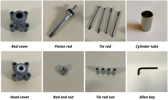A training use case helps to demonstrate the capabilities of the virtual instructor framework. For that purpose, a Pneumatic Cylinder (PC) assembly operation was selected to demonstrate the PoC due to its common use in industry and easy availability for testing. This device aims to convert the compressed air into mechanical movement [36]. This is possible by moving a piston inside a PC, where the introduced air causes pressure, moving it in a linear direction. It is essential in industrial systems where precise movements are required. Figure 2 illustrates seven PC distinct parts. In addition to the two already mentioned, these include a rod cover, head cover, tie rod, rod end nut, and tie rod nut. In addition, the image consists of the Allen key required to tighten the tie rod nuts.