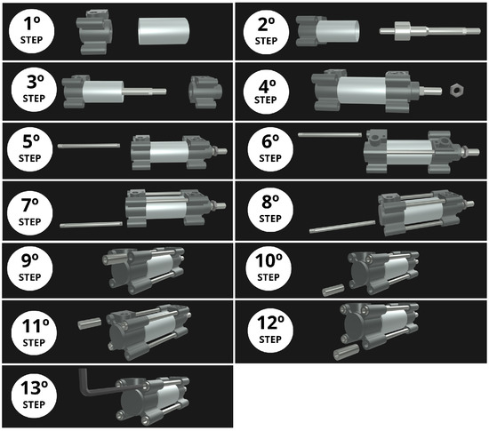 Three-dimensional animations assisting the Pneumatic Cylinder assembly operation.