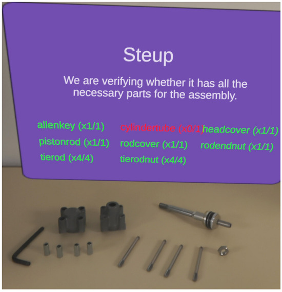 Upon project selection, the system verifies that all required parts are available in the necessary quantities, as shown in Figure 6, helping to maintain smooth operation on the assembly line. Since all objects are detected, the operations to be completed are returned. The operator can check the provided instructions in the training animations from the 3D Modeling module, which contains instructions that overlap with the physical work environment. Therefore, Figure 7 represents the operation and the corresponding 3D animation guiding one of the steps of the PC assembly operation. After that, the operator can proceed and complete the assigned operation. Its performance is tracked during the operation by recording all the actions and execution times.