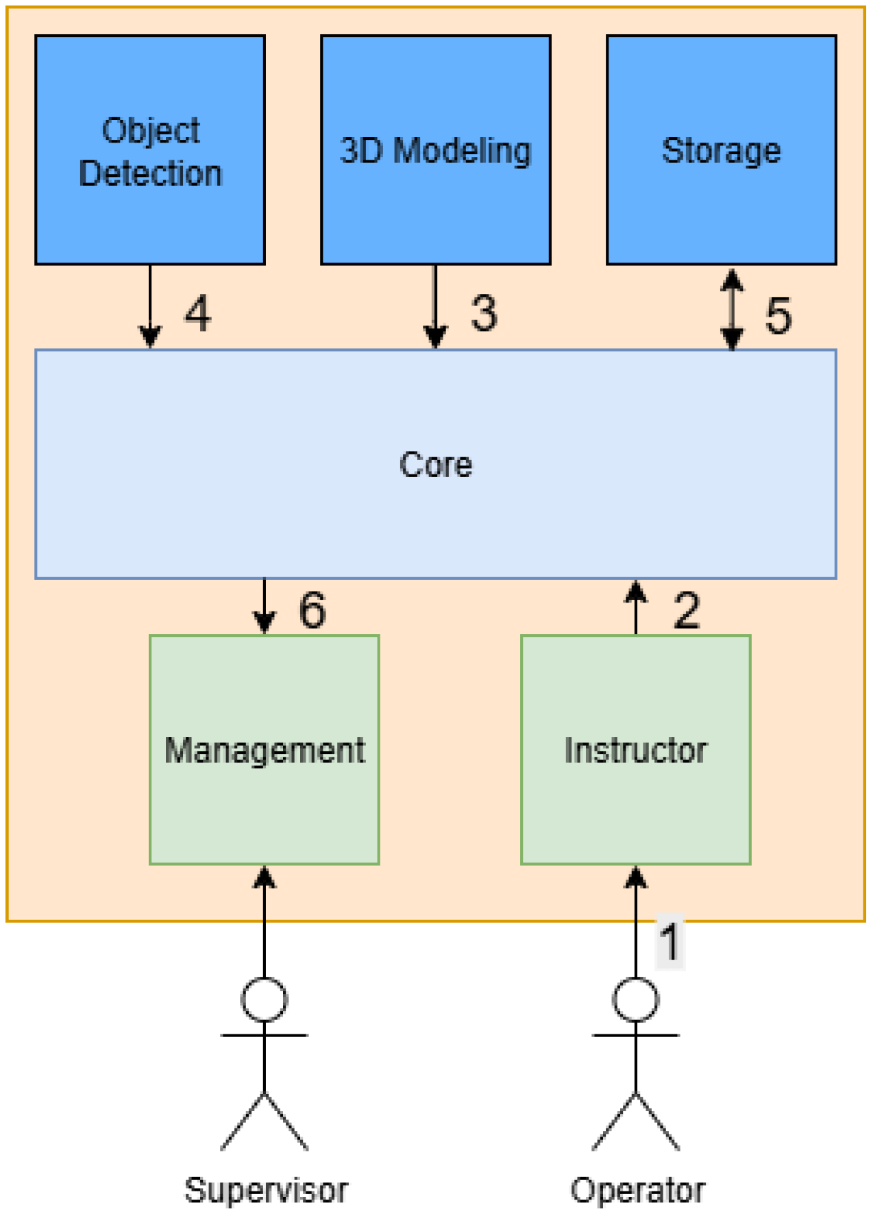 Figure 1 depicts the reference architecture of the proposed framework. It includes the building blocks and the underlying communication flows (1 to 6). The following building blocks are included: Management, Core, Object Detection, 3D Modelling, Storage, and Instructor.