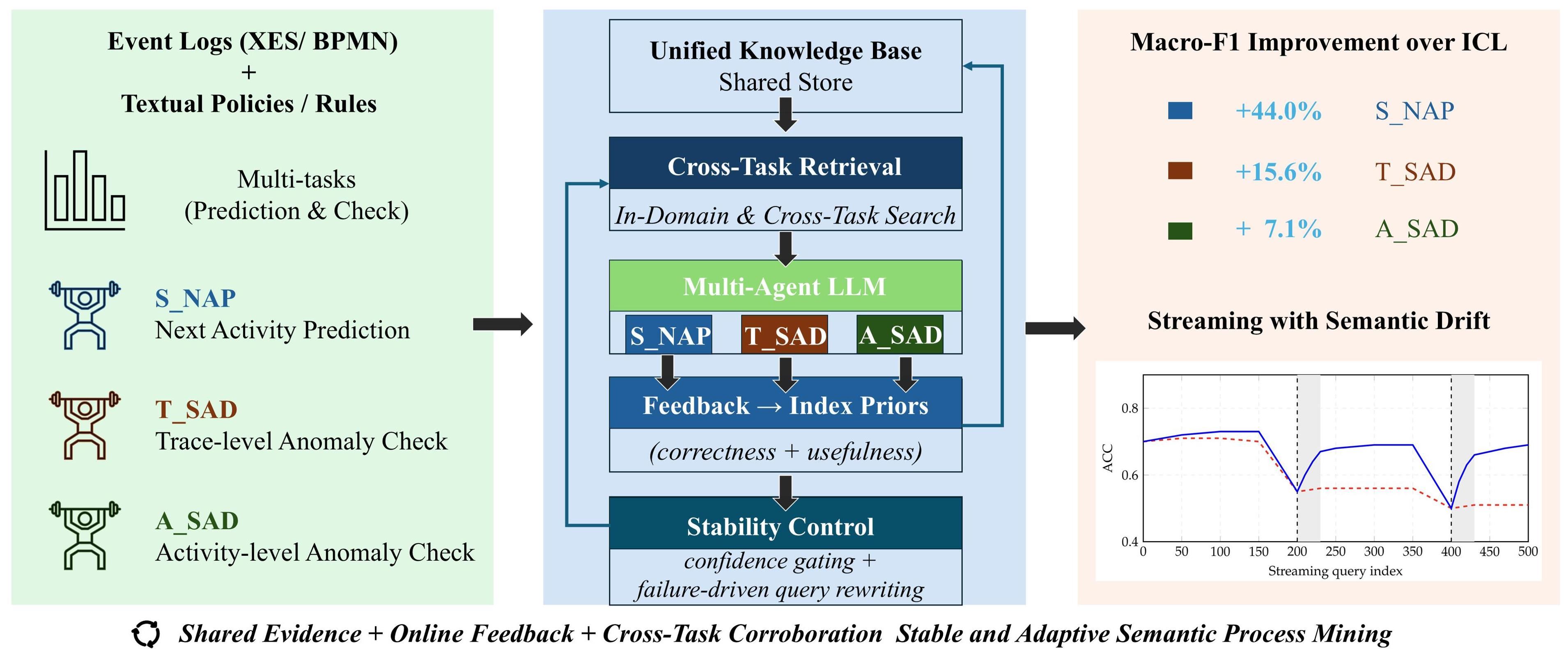 Across S_NAP, T_SAD, and A_SAD, the framework consistently outperforms retrieval-only and agent-only baselines while matching or exceeding correction-centric frameworks, with the most pronounced gains where fine-grained evidence discrimination is required. Ablations show that feedback-to-index priors are the primary driver of next-query improvements, cross-task corroboration contributes broadly across tasks, and confidence gating enhances robustness to difficult or noisy inputs. These results indicate that coupling shared evidence, online feedback, and targeted correction yields a stable and effective path to improving semantic process-mining tasks without heavy fine-tuning.