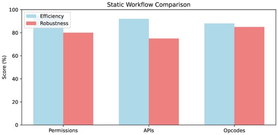 Comparative analysis of static analysis workflow sub-components (e.g., permissions vs. APIs vs. opcodes in extraction/feature engineering): Efficiency (%) reflects normalized overhead (high = low compute); Robustness (%) indicates F1 retention under obfuscation (aggregated from [12,17,45].)