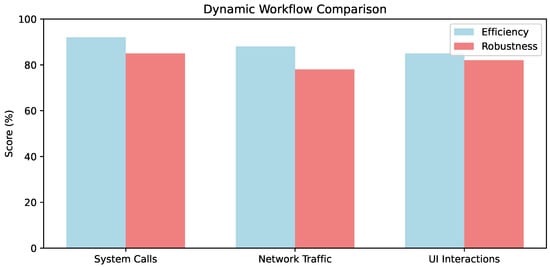 Comparative analysis of dynamic workflow sub-components (e.g., system calls vs. network traffic vs. UI interactions in runtime capture): Efficiency (%) denotes trace processing speed; Robustness (%) shows evasion resistance (from [Papers [9,16,33]].)