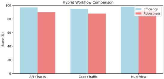 Comparative analysis of hybrid analysis workflow sub-components (e.g., API+traces vs. code+traffic vs. multi-view in fusion): Efficiency (%) measures integrated latency; Robustness (%) captures polymorphic F1 gains (per [Papers [10,21,62]]).