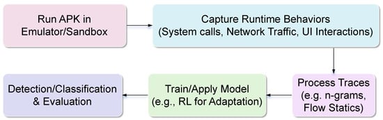 As illustrated in Figure 6, dynamic analysis focuses on runtime observation to uncover behaviors that may remain hidden during static inspection, making it particularly effective against obfuscation and polymorphism in Android malware. Typically, APKs are executed in controlled environments such as emulators, sandboxes, or testbeds [13,14,18,19,20,52,53,55], which simulate real usage while avoiding risks to physical devices. During execution, diverse features are captured, including system calls [13,18,47], network traffic traces [49,50,51,52,53], behavioral logs of UI or API interactions [14,55], and even concolic execution paths [20]. To address noise and scalability issues, these raw features are further processed through techniques such as n-gram on traces, swarm optimization for feature reduction [19,50], or damped statistical updates in reinforcement learning (RL) [18]. The refined data is then used for model training, where methods like RL are adopted for drift adaptation, metric learning for few-shot scenarios [49], and open set recognition (OSR) for handling unseen threats [52,53]. Despite its robustness against encrypted and polymorphic malware, dynamic analysis still faces challenges, including computational overhead, emulator divergences [20], dependency on user interactions [55], and partial blind spots in encrypted traffic [49].