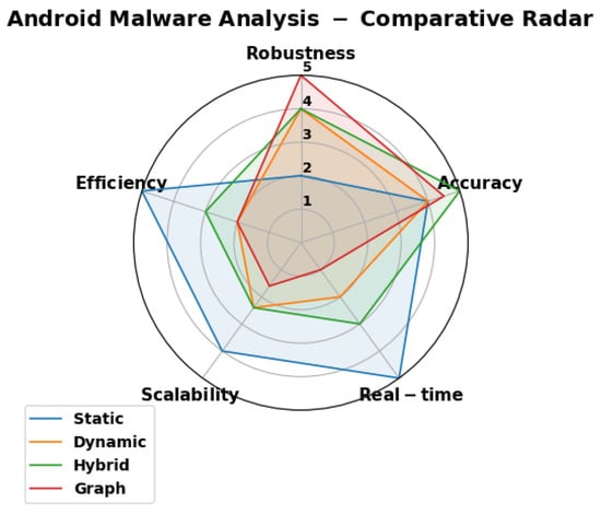 Hybrid analysis techniques combine static and dynamic approaches to mitigate intra-paradigm gaps through feature fusion. As illustrated in Figure 3, multi-view integrations achieve peak robustness (92%) and efficiency (98%) against polymorphic threats, surpassing API-plus-trace methods (90%/97%) by 2–5% in F1 through complementary static–dynamic representations [36,60,61].