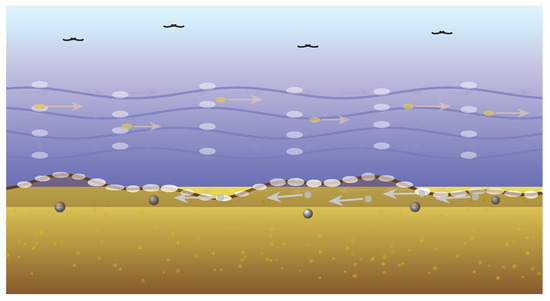 Tide and undertow dynamics. Surface debris and birds move with the incoming tide (rightward), while sediment near the beach is pulled back by undertow (leftward). Wave angle and particle trajectories reveal the dual flow system.