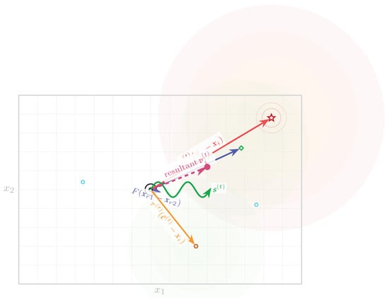 Vector decomposition of movement strategy. Current agent position experiences five force components that combine to form the mutant vector . Contour-like regions indicate fitness landscape structure.