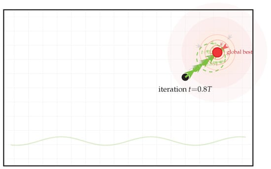 REO balances exploration and exploitation via (Equation (6)) amplitude decay, the drift probability in Equation (13), and growing tide Equation (5). Early iterations have larger , higher , and weaker tide, yielding long-range, multi-directional search; late iterations invert these proportions. We depict the progression in two separate figures: Figure 6 (early) and Figure 7 (late).