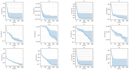 Each operator follows a complementary schedule: the undertow increases with solution quality, the tide increases with iteration count, the swell amplitude decreases with time, and Lévy kicks are applied only early in the search. These opposing schedules define a consistent exploration–exploitation trajectory: broad exploration in early iterations followed by controlled exploitation near convergence. The combined “two-anchor’’ behavior—bias toward both and —is absent in GA, PSO, and classical DE.
