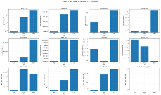 REO In comparison with JADE (or classic DE: (i) Two anchors vs one: JADE’s step uses a single sampled p-best (Equation (21)). REO adds rank-aware pull to and a time-growing pull to , producing a two-anchor bias not expressible as with any scalar F. (ii) Rank/time coupling: depends on rank; depends on time; these cannot be absorbed into a constant or jDE-updated without changing the anchor point(s) and introducing quality conditioning. (iii) Swell: adds a zero-mean, span-aware, scheduled oscillation that is not part of DE’s differential term and cannot be re-parameterized as .