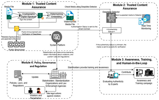 In the first module of the framework, media content can be authenticated through digital watermarking and cryptographic signatures which are then stored along with the metadata of the content on the blockchain. The second module conducts deepfake detection as needed to ensure that the content is authentic and not manipulated. The third module involves intervention from an experienced human to verify the authenticity of the content in case deepfake detection fails. Eventually, the fourth module is activated if deepfake content is identified, escalating the case to ensure law enforcement involvement, supporting forensic analysis efforts, and notifying concerned parties.