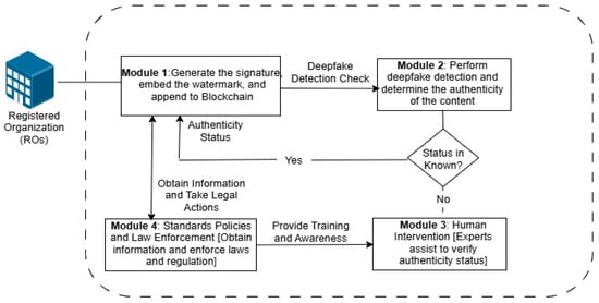 The next subsection demonstrates how the different framework modules and stakeholders interact with each other within the deepfake prevention system.