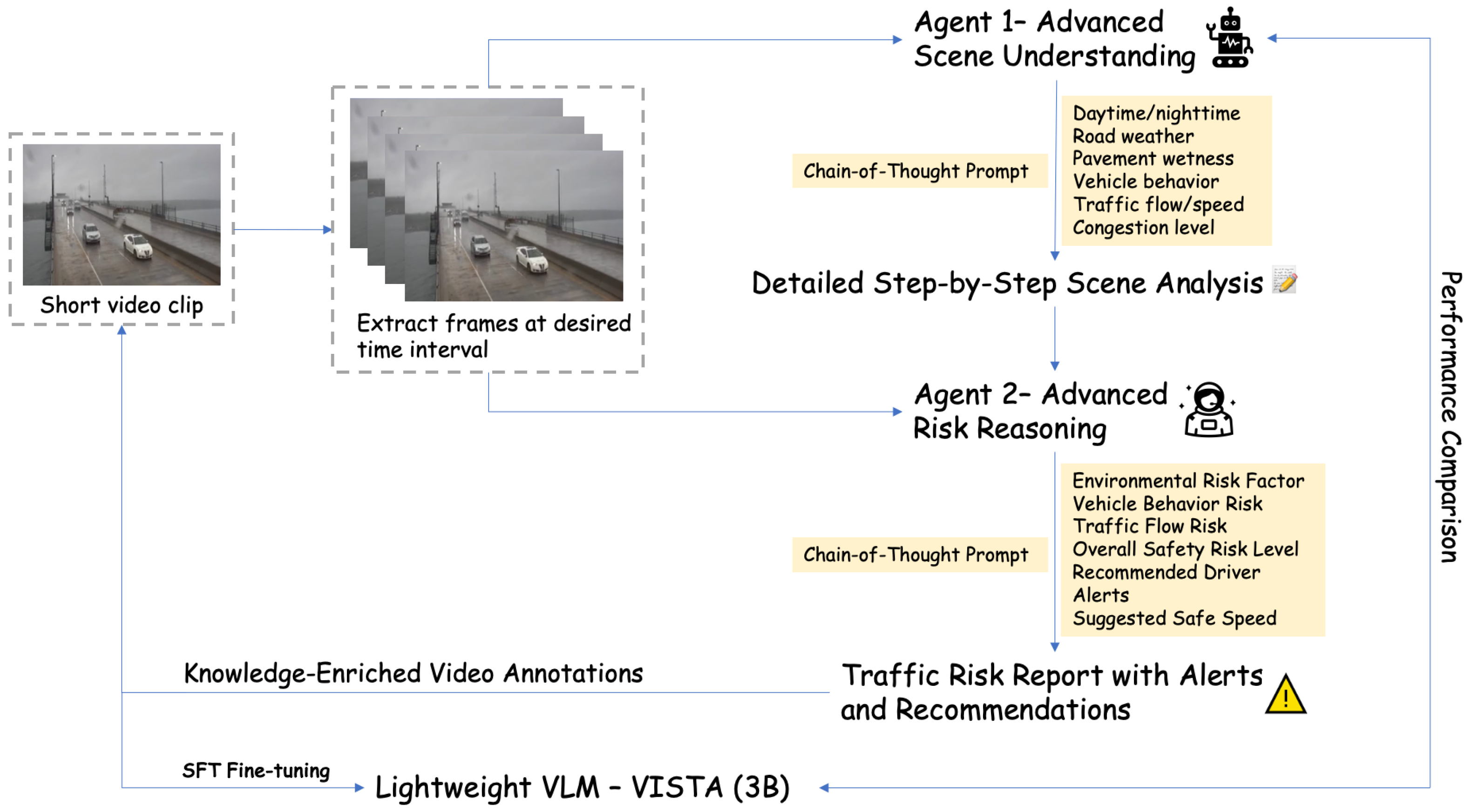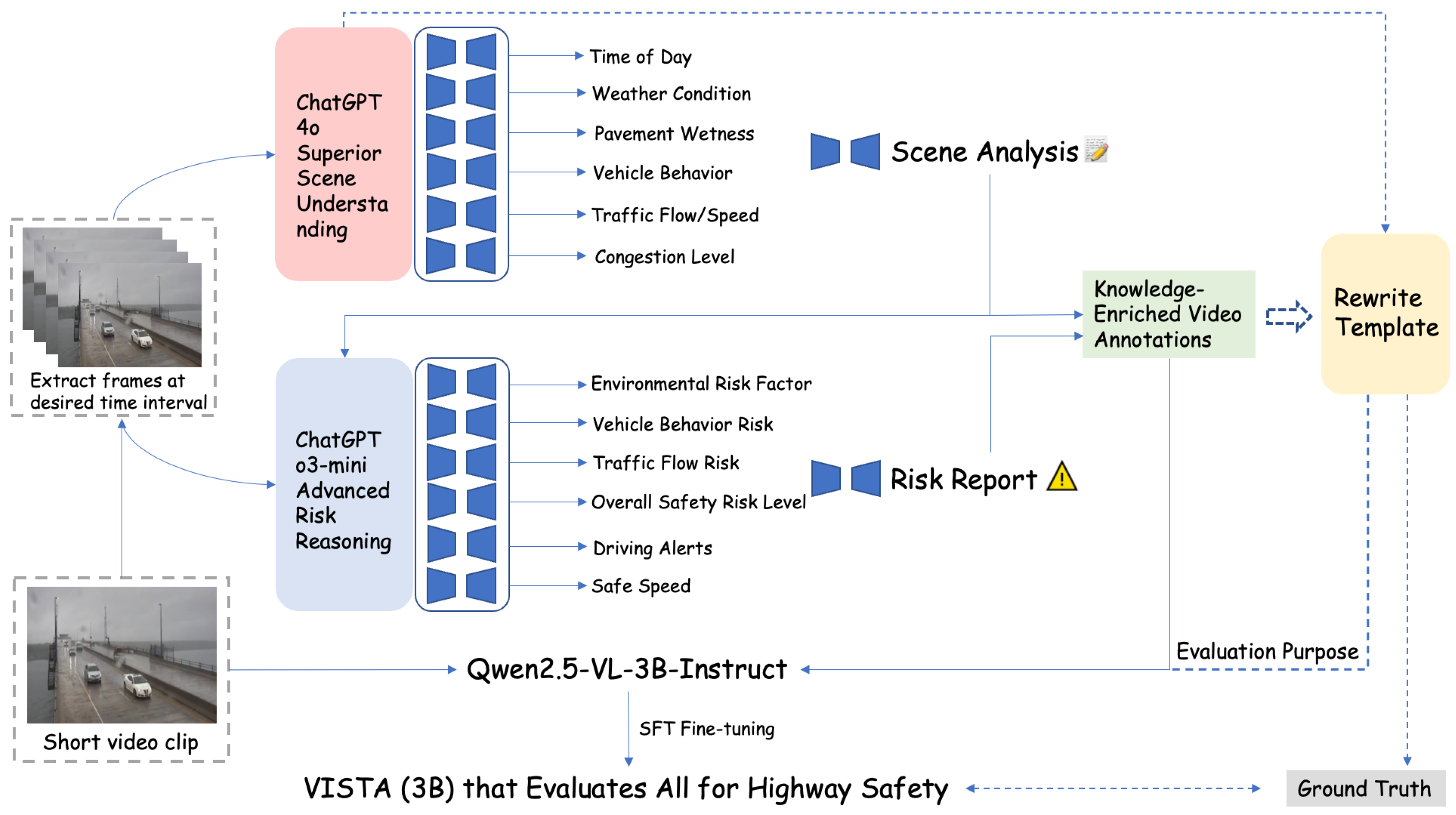 - Role-Aware Knowledge-Enriched Supervision.The first path generates rich, semantically grounded annotations from a pair of expert LVLMs: GPT-4o and o3-mini. Specifically, we sample frames from short video clips and pass them along with two specialized prompting branches: (i) GPT-4o for fine-grained scene analysis and captioning, and (ii) o3-mini for contextual risk reasoning. Their outputs are merged and organized into structured, knowledge-enriched video annotations which are used as pseudo-labels to supervise the fine-tuning of a 3B student model (Qwen2.5-VL-3B-Instruct), leading to our VISTA model, suitable for deployment in real-world highway safety monitoring.