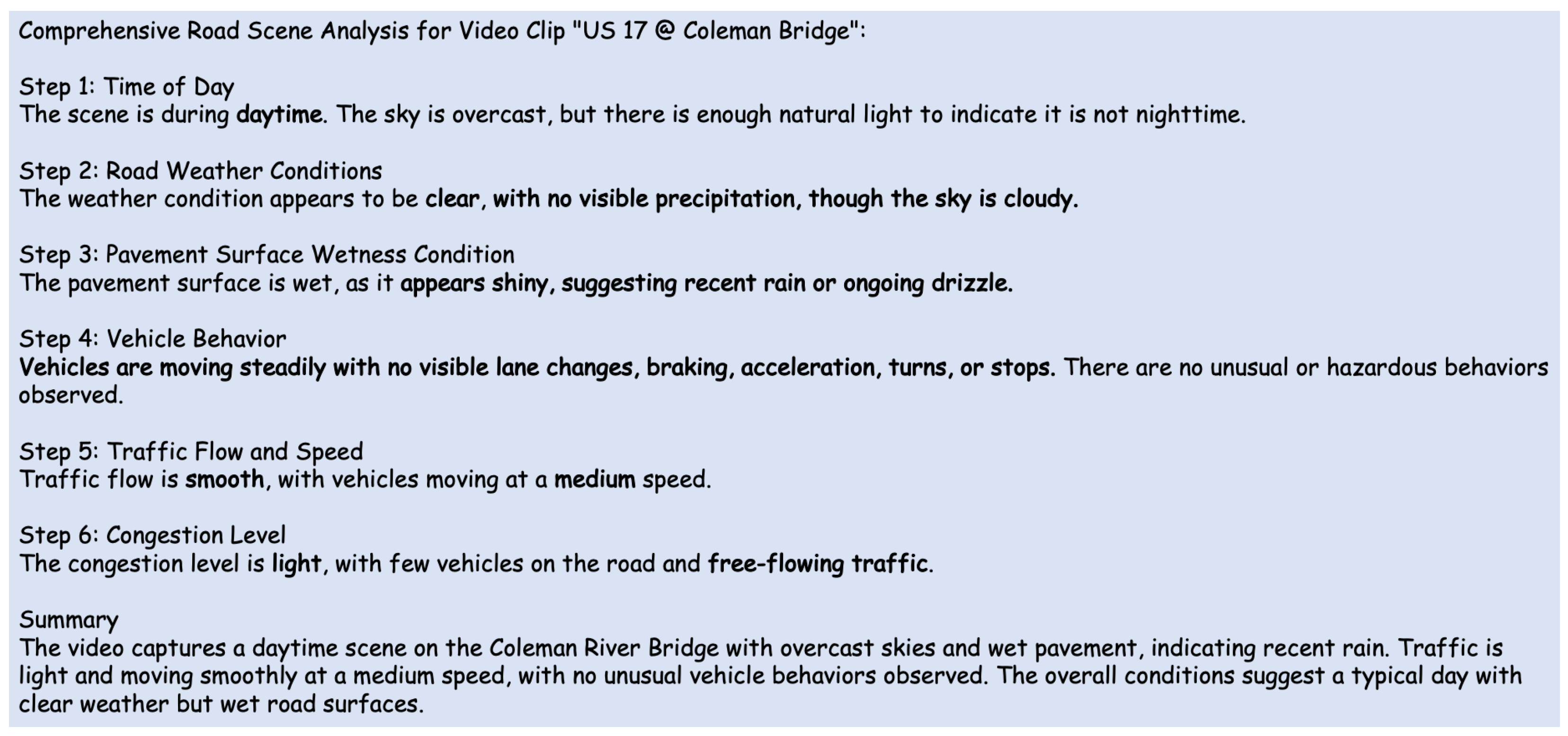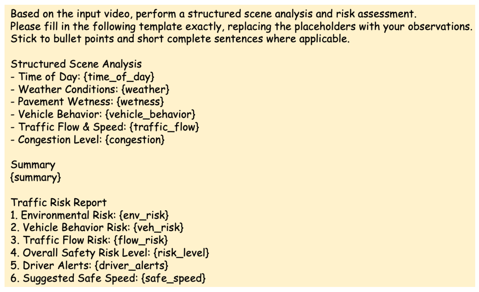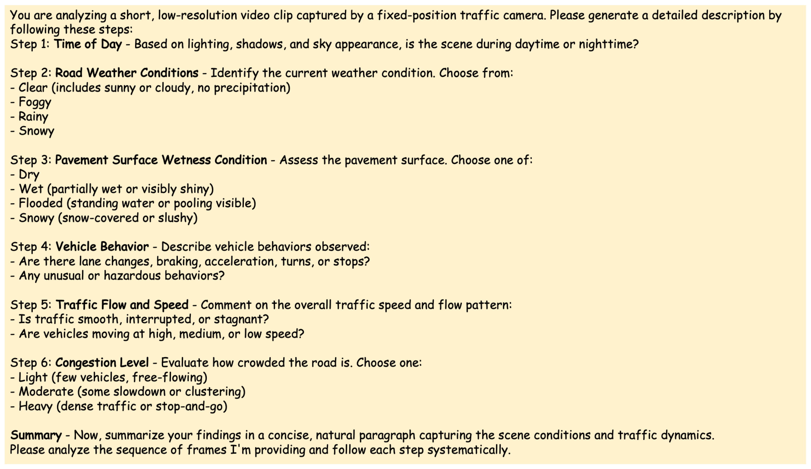 - Environmental Risk Factors: This component focuses on analyzing the interplay between visibility, weather, and pavement surface conditions—three critical elements in assessing traffic safety. Time of day plays a decisive role in determining visibility, with nighttime or low-light conditions significantly impairing a driver’s ability to detect road hazards, pedestrians, or surface anomalies such as standing water or debris. Weather factors such as rain, fog, or snow further compound these risks by introducing glare, reduced contrast, or obscured features. Pavement wetness, in particular, poses substantial safety concerns by affecting vehicle traction, braking distance, and hydroplaning likelihood. For example, a reflective road surface under overcast skies may suggest recent precipitation, while visible pooling indicates potential flooding. Distinguishing between partially wet and deeply saturated pavement is therefore crucial for anticipating vehicle instability and enabling downstream risk prediction. The CoT prompt guides the model to reason across these dimensions collectively, enabling a comprehensive assessment of how environmental conditions influence roadway safety.