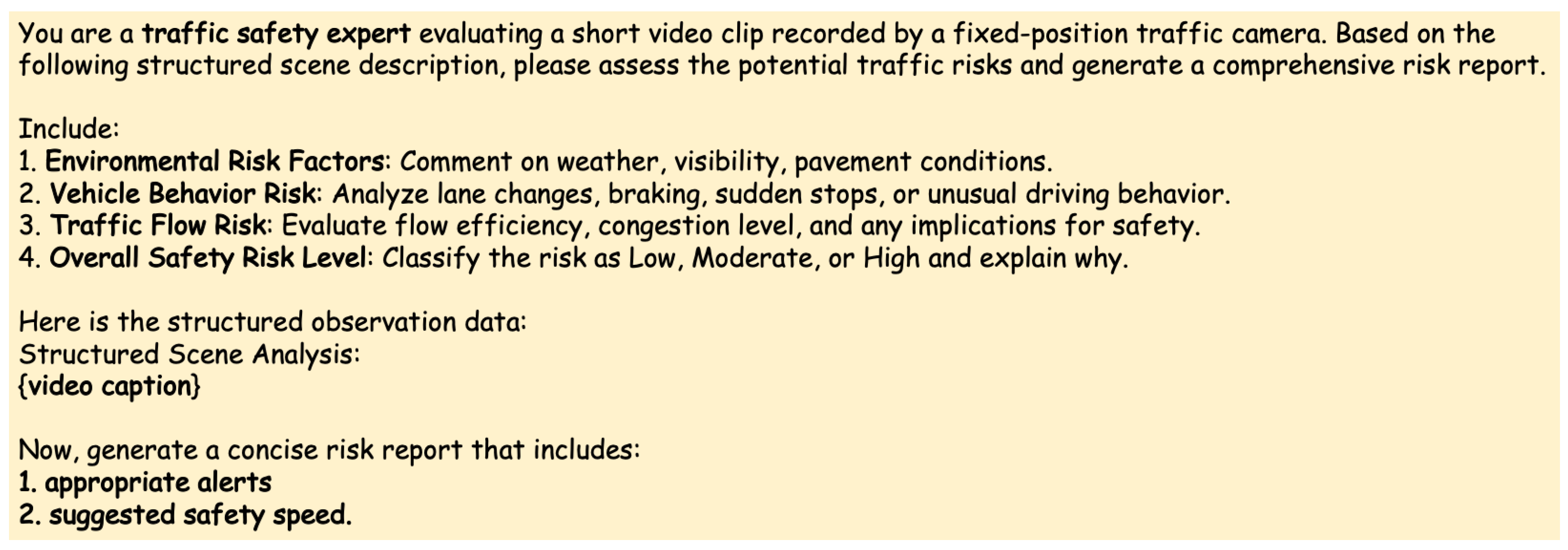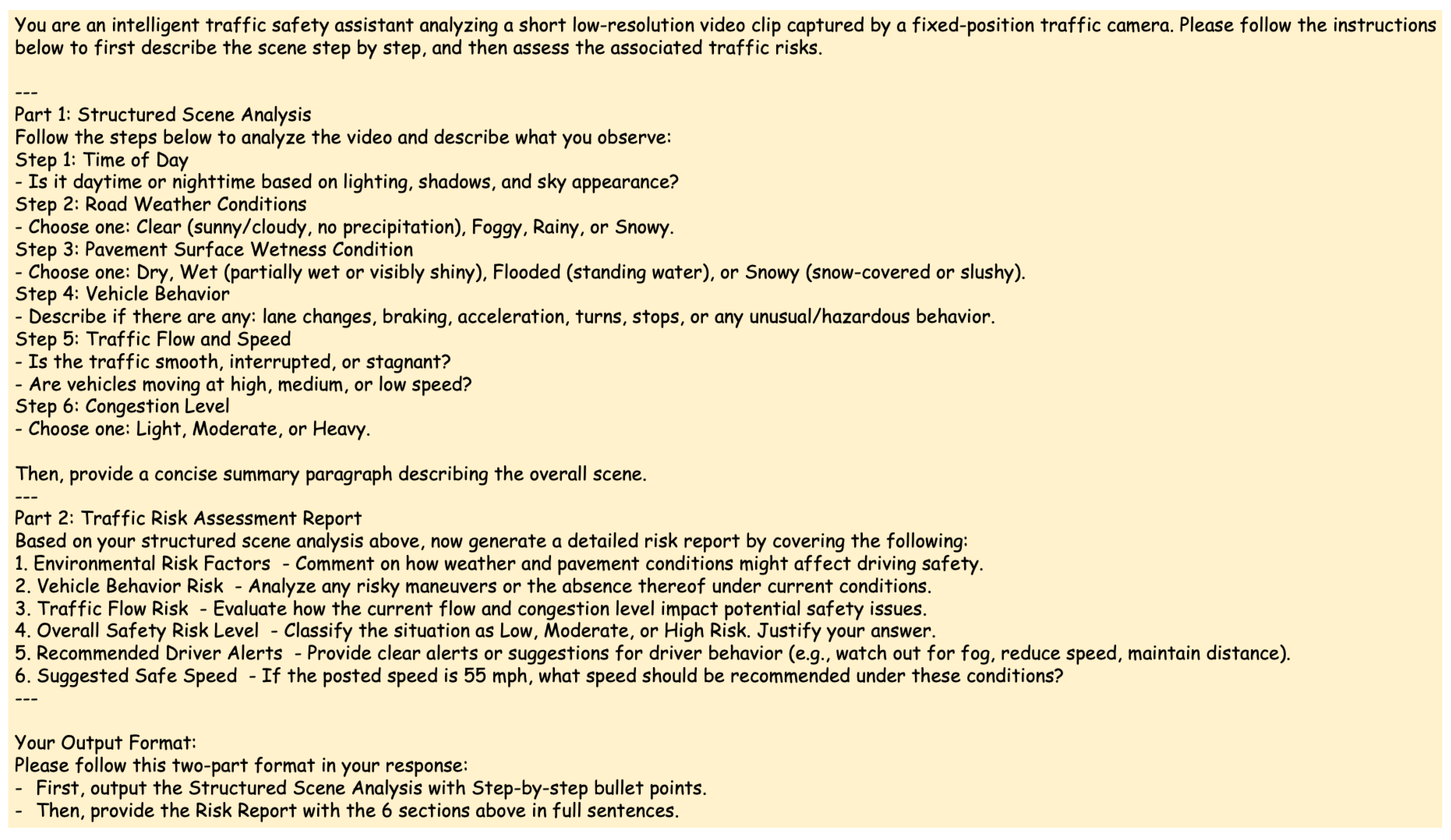 - Traffic Flow Risk: This component assesses the stability and efficiency of traffic flow to identify dynamic risk patterns. Consistent, smooth flow typically indicates low interaction risk, whereas abrupt fluctuations in vehicle speed or spacing may signal unexpected environmental disturbances—such as roadway obstructions, water accumulation, or sudden visibility drops. Such disruptions not only degrade flow efficiency but also elevate the probability of rear-end collisions, particularly under conditions of limited traction or poor visual perception. The CoT prompt enables the model to reason temporally, detecting irregularities in flow continuity and interpreting them as early indicators of potential hazards ahead. This temporal perspective is critical for proactive traffic risk evaluation.