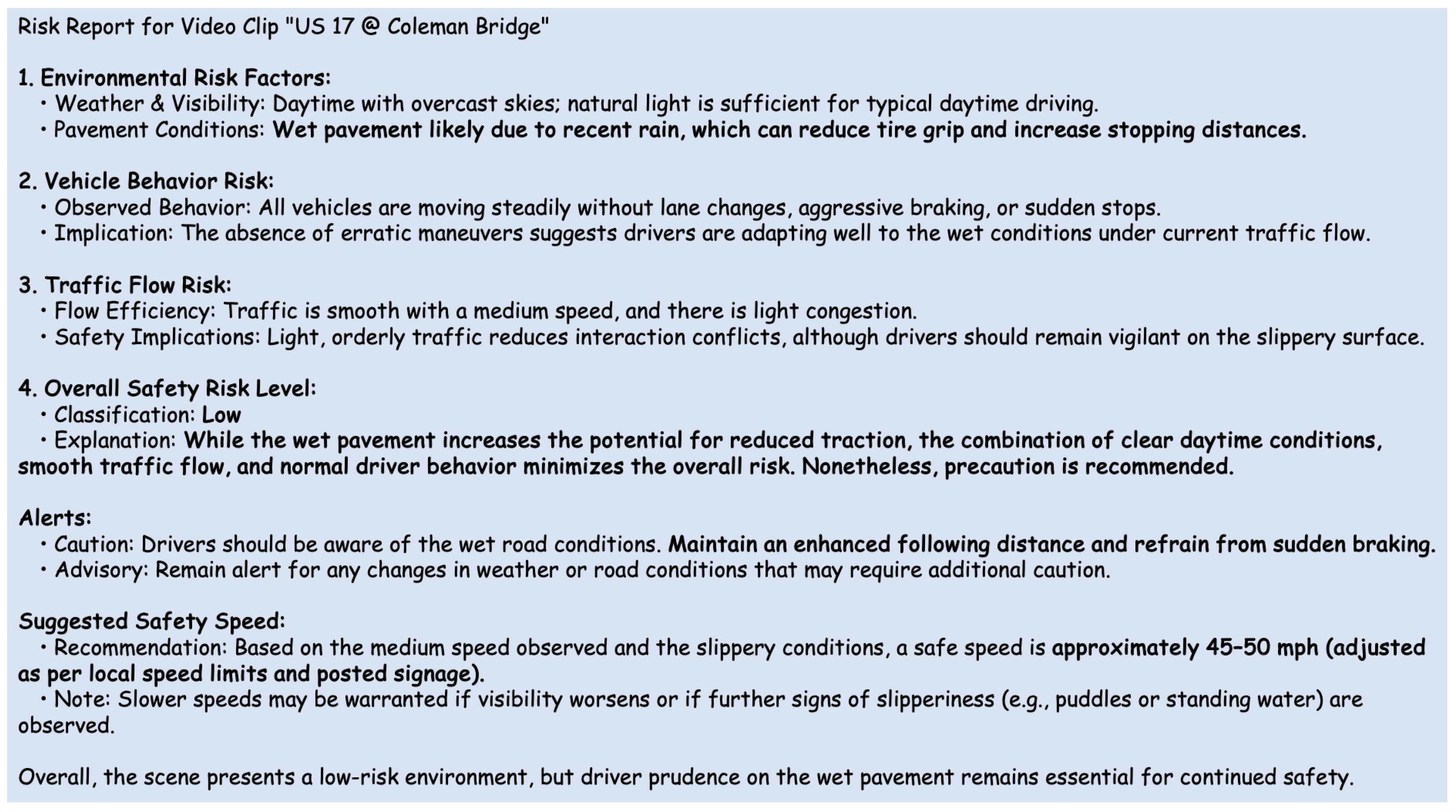 - Vehicle Behavior Risk: This dimension evaluates whether the observed driving patterns suggest cautious or erratic behavior, offering insight into potential latent hazards. Behavioral responses such as sudden braking, abrupt acceleration, or frequent lane changes often reflect driver reactions to perceived risks—such as reduced visibility, surface irregularities, or obstructions not directly captured in the visual field. Importantly, clusters of such evasive maneuvers across multiple vehicles may signal the presence of high-risk zones ahead, including flooded pavement, debris fields, or stalled traffic. By analyzing both the frequency and distribution of these maneuvers, the model can infer emergent risk factors and support preemptive safety reasoning that extends beyond the immediate visual context.