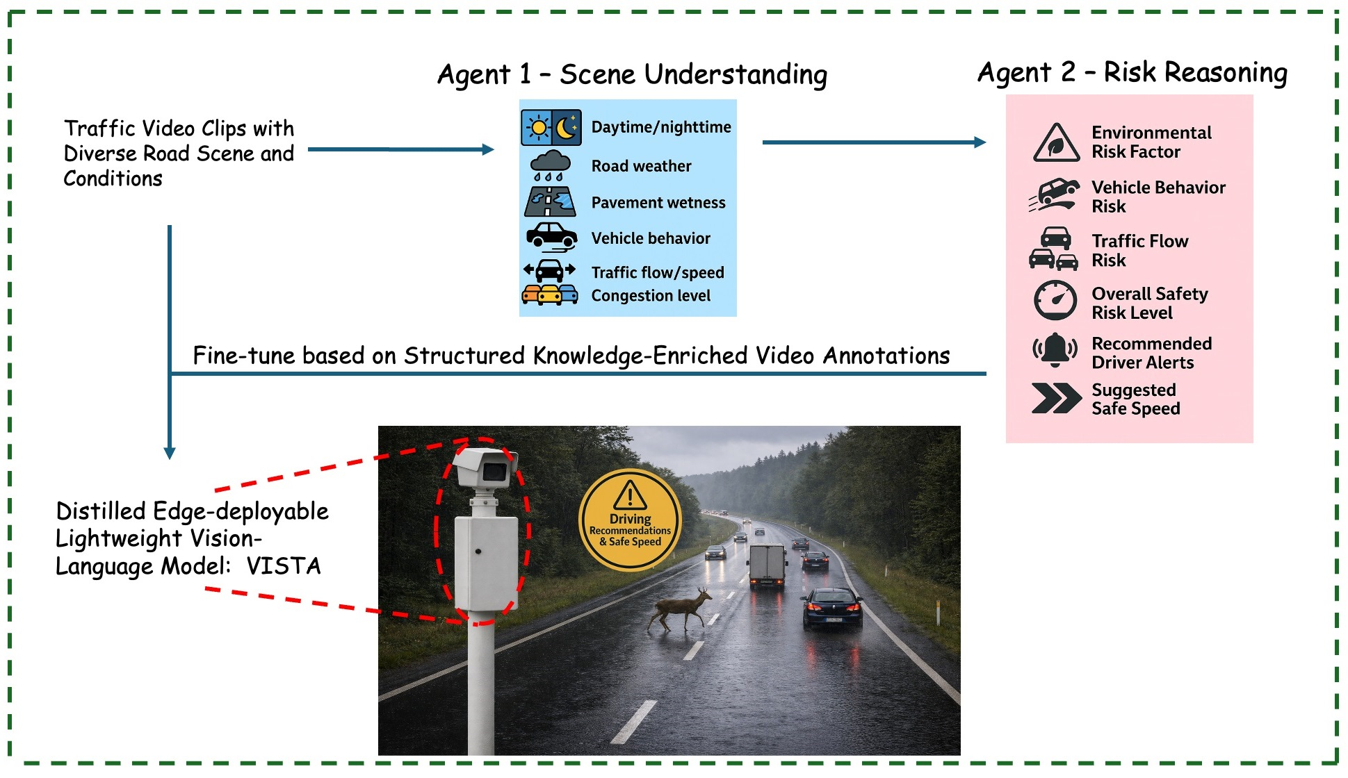 - Role-Aware Knowledge-Enriched Supervision.The first path generates rich, semantically grounded annotations from a pair of expert LVLMs: GPT-4o and o3-mini. Specifically, we sample frames from short video clips and pass them along with two specialized prompting branches: (i) GPT-4o for fine-grained scene analysis and captioning, and (ii) o3-mini for contextual risk reasoning. Their outputs are merged and organized into structured, knowledge-enriched video annotations which are used as pseudo-labels to supervise the fine-tuning of a 3B student model (Qwen2.5-VL-3B-Instruct), leading to our VISTA model, suitable for deployment in real-world highway safety monitoring.